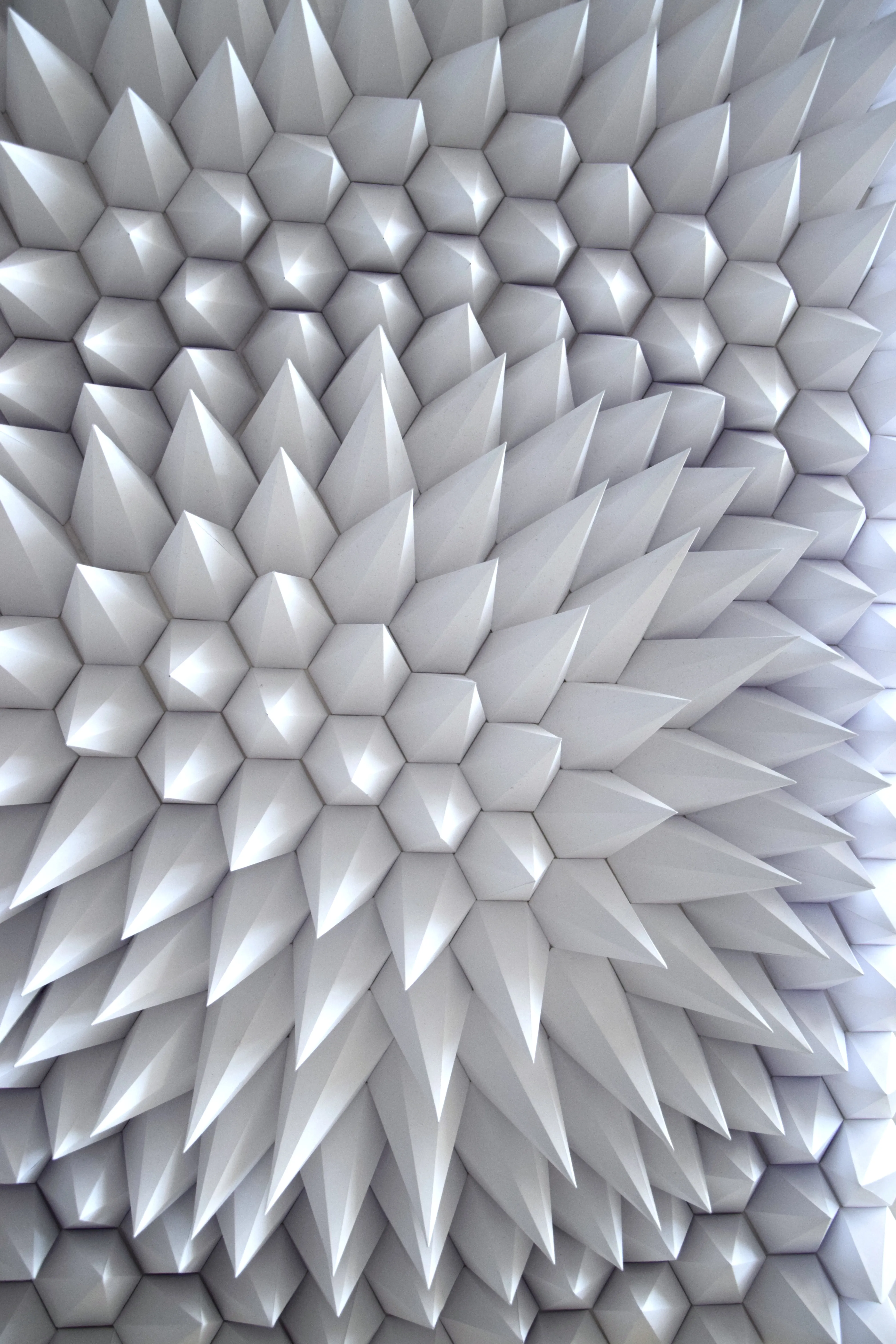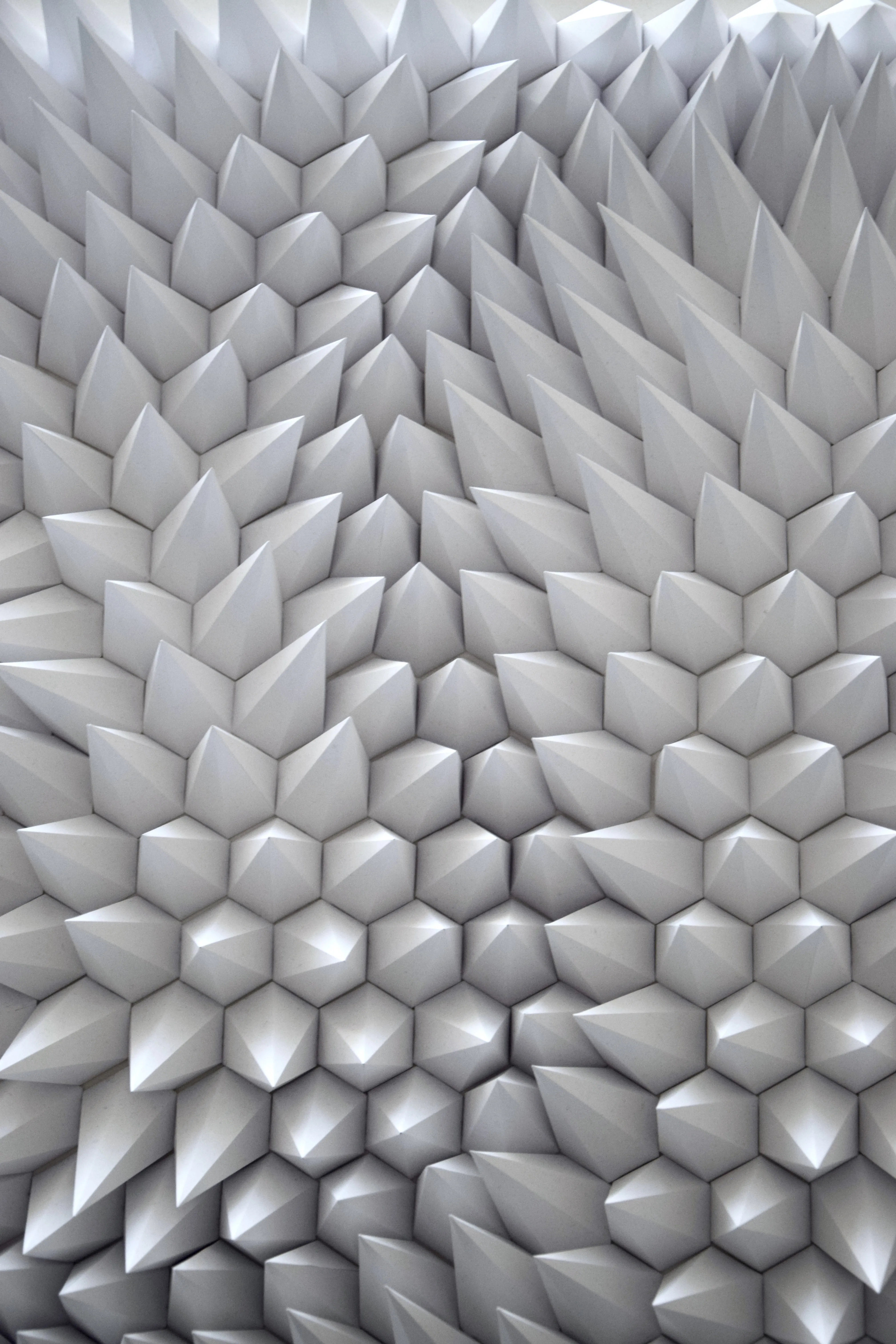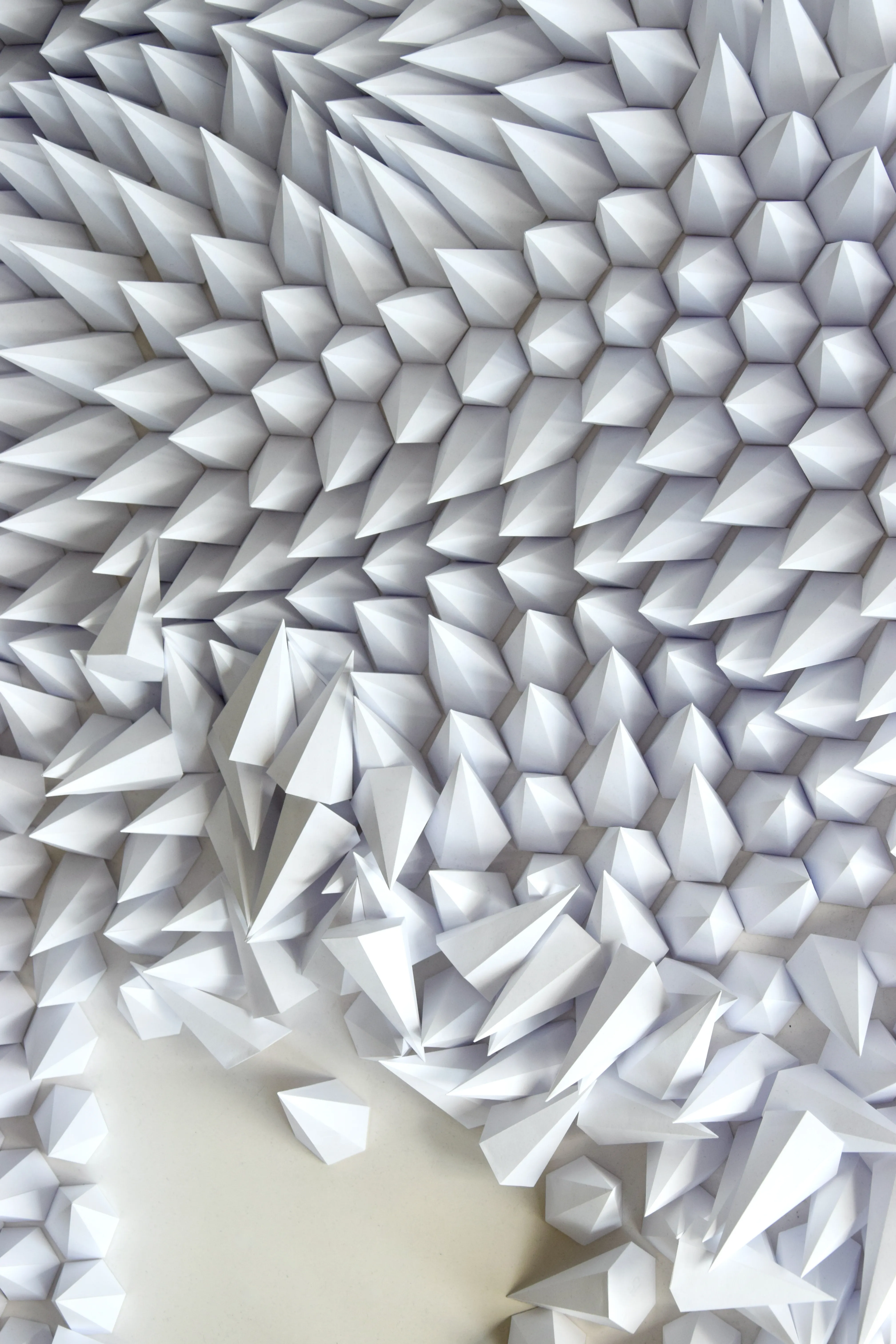 Die Papier-Skulptur wurde aus zahlreichen, unterschiedlich geneigten Sechseckpyramiden konstruiert. Diese sind so angeordnet, dass sie eine wellenartige Bewegung nachbilden, welche durch die gesamte Komposition fließt und den Eindruck einer gefrorenen Textur vermittelt.