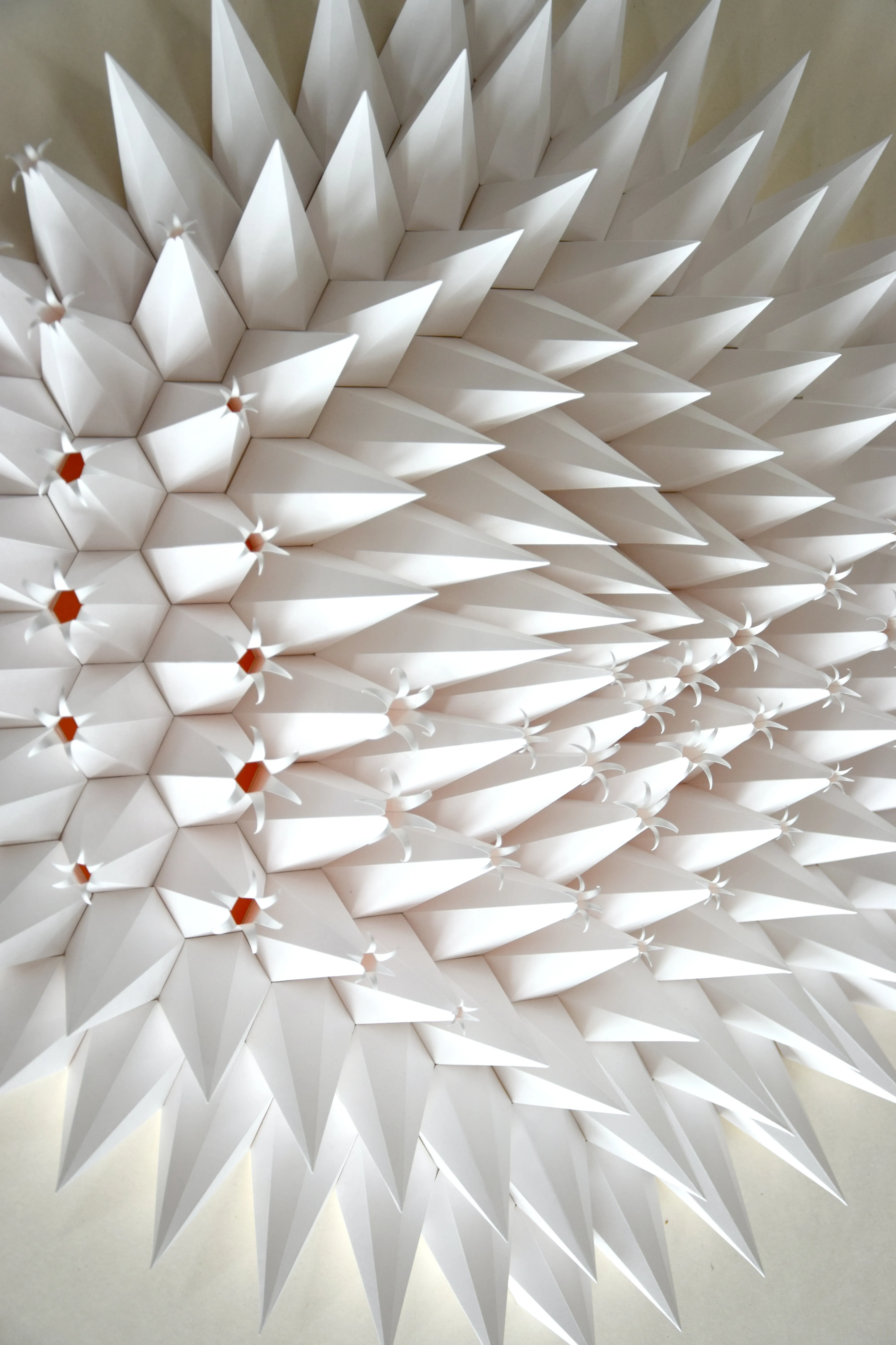 Die Stachelblume ist eine sorgfältig gestaltete, dreidimensionale Papierinstallation, die aus einer Vielzahl filigraner, sechseckiger Pyramiden besteht. Einige dieser Pyramiden sind geöffnet und enthüllen kräftige Farbakzente im Inneren, die dem Werk eine unerwartete Tiefe verleihen.