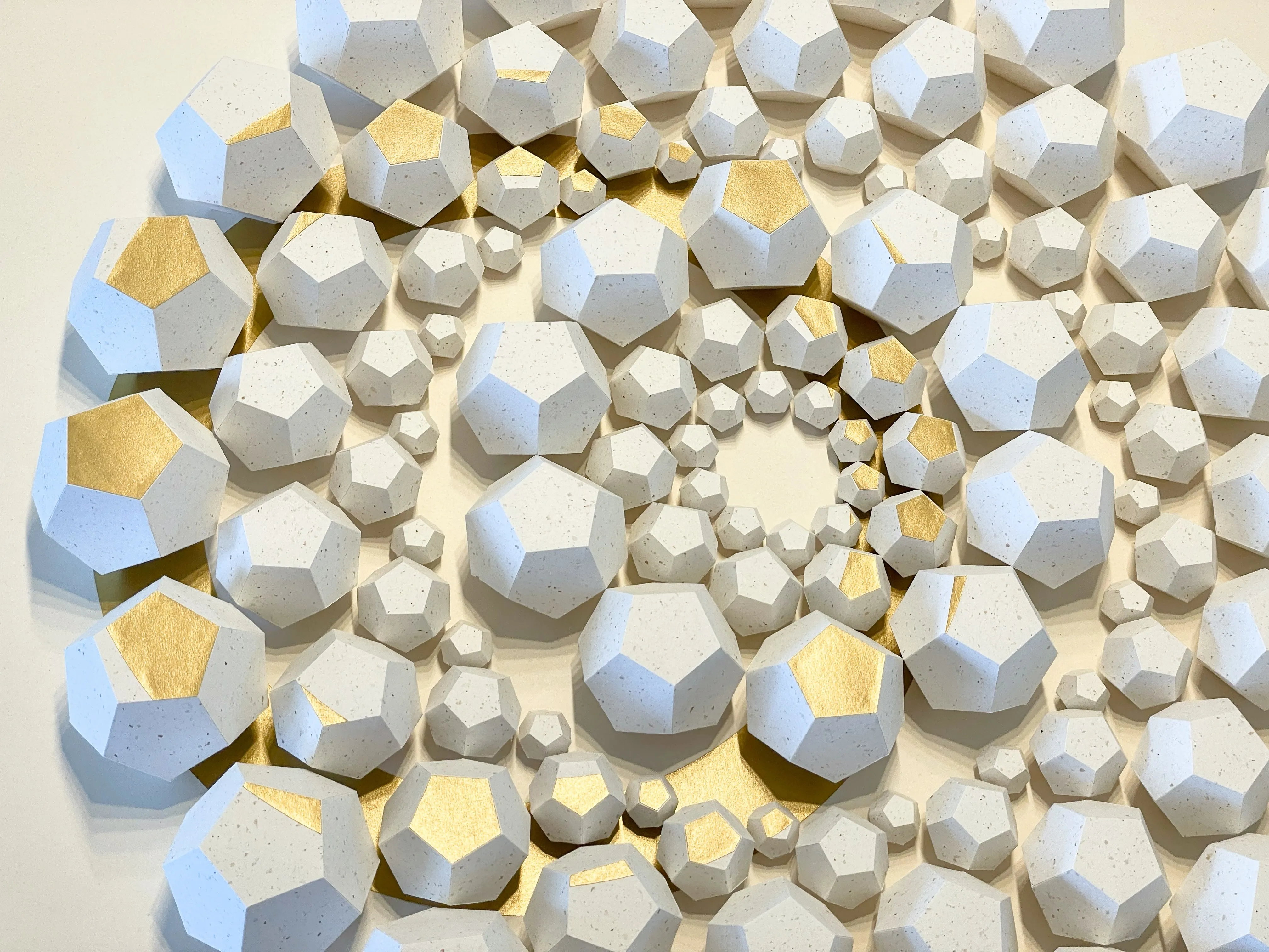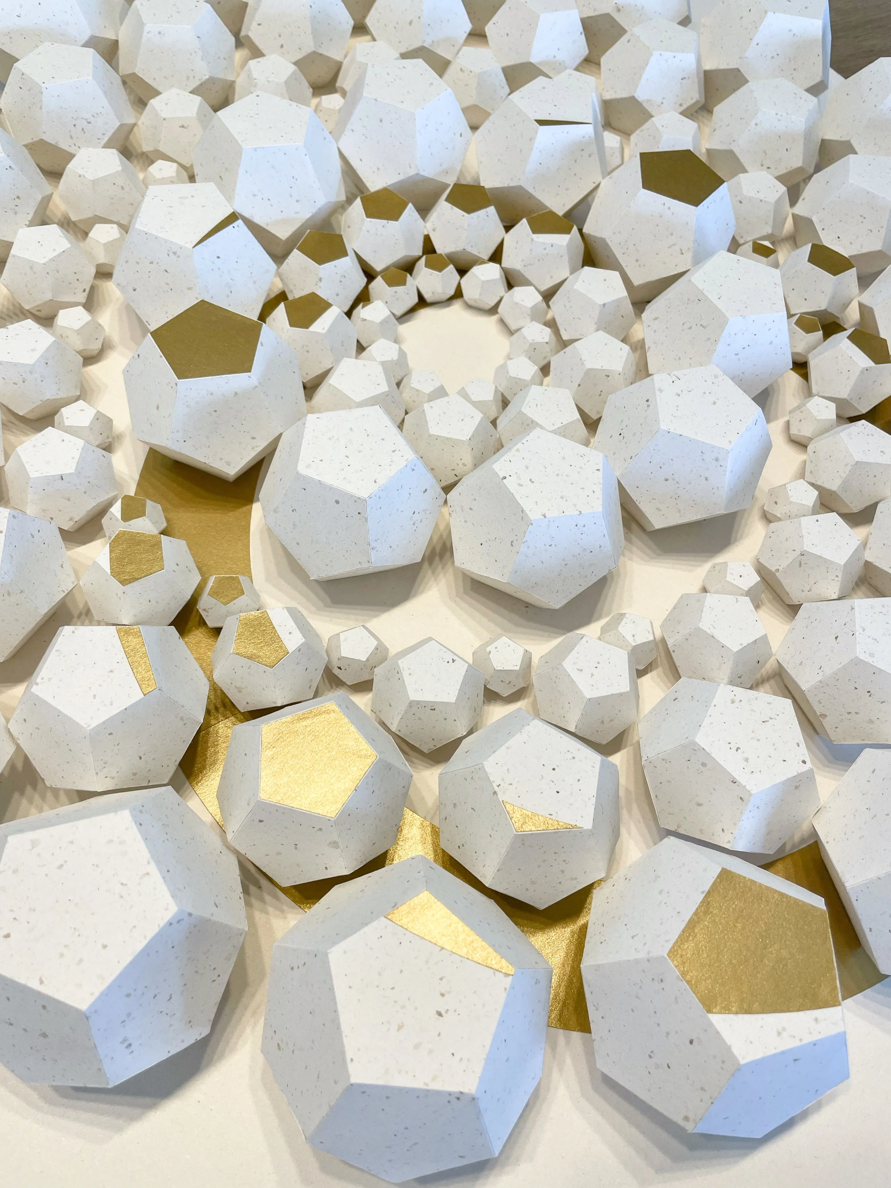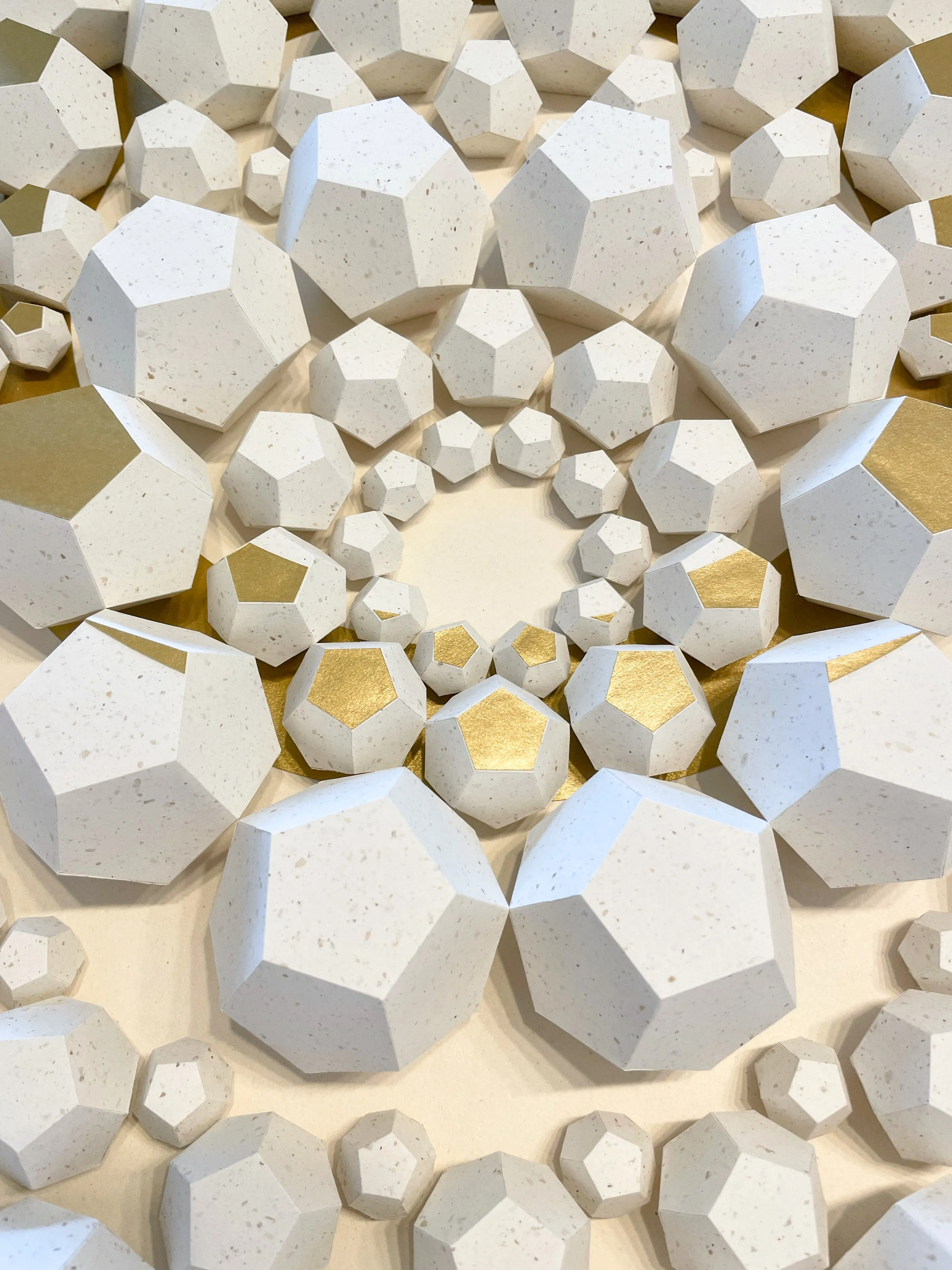 “Exoresonance” features handcrafted dodecahedrons made from sustainable recycled paper with natural inclusions from coffee production. The work addresses ecological responsibility and highlights the importance of paper as a valuable natural resource. The arrangement of geometric shapes in a concentric wave structure symbolizes nature’s cycles and illustrates the interactions of our ecosystems.