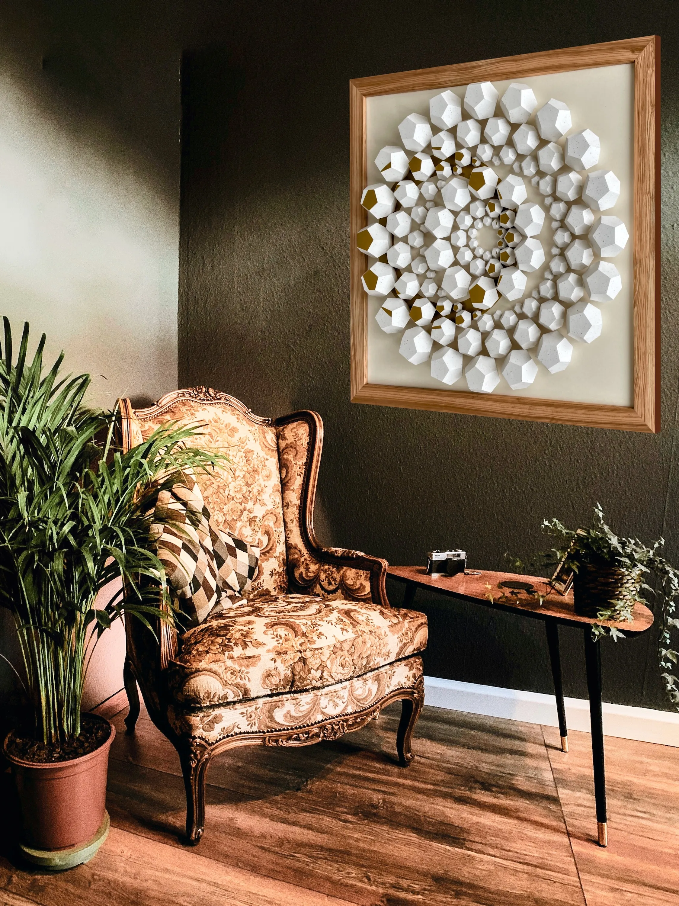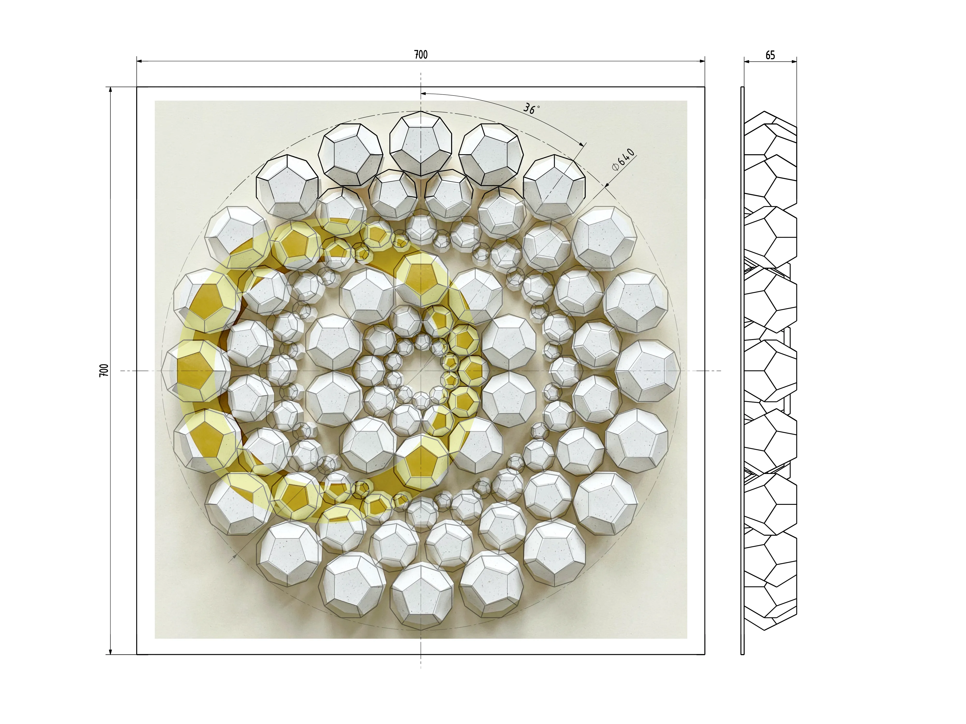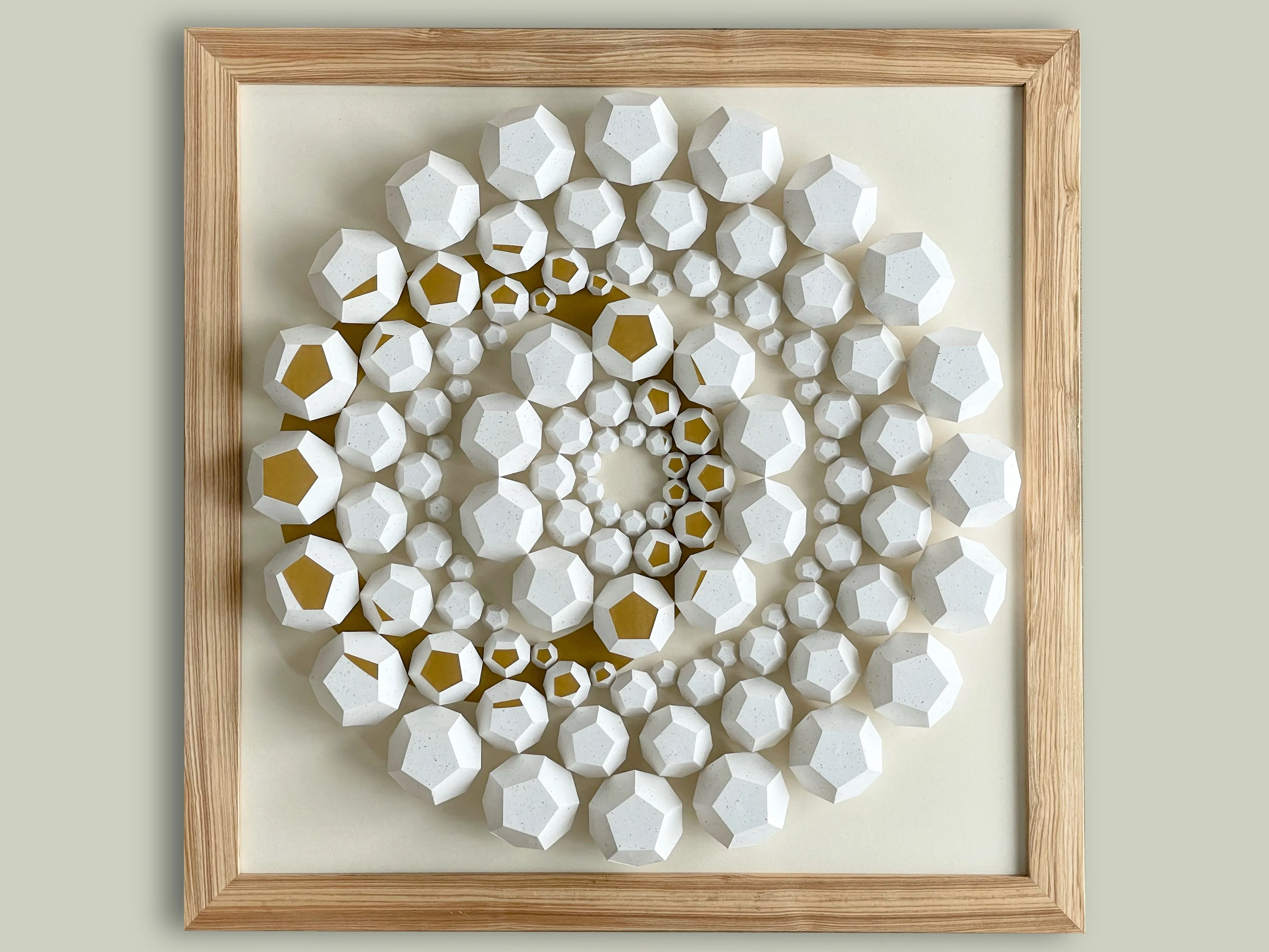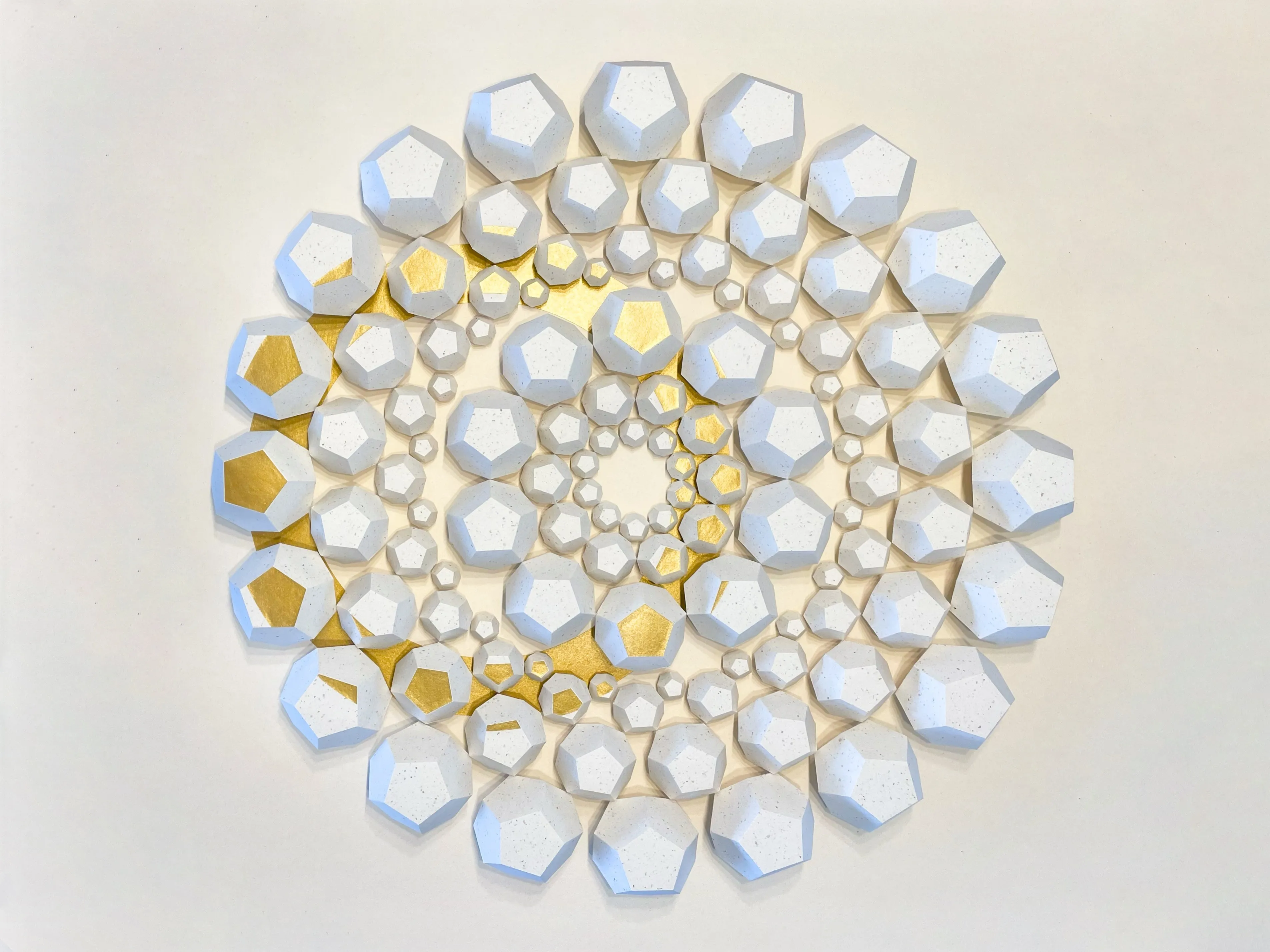 “Exoresonance” features handcrafted dodecahedrons made from sustainable recycled paper with natural inclusions from coffee production. The work addresses ecological responsibility and highlights the importance of paper as a valuable natural resource. The arrangement of geometric shapes in a concentric wave structure symbolizes nature’s cycles and illustrates the interactions of our ecosystems.