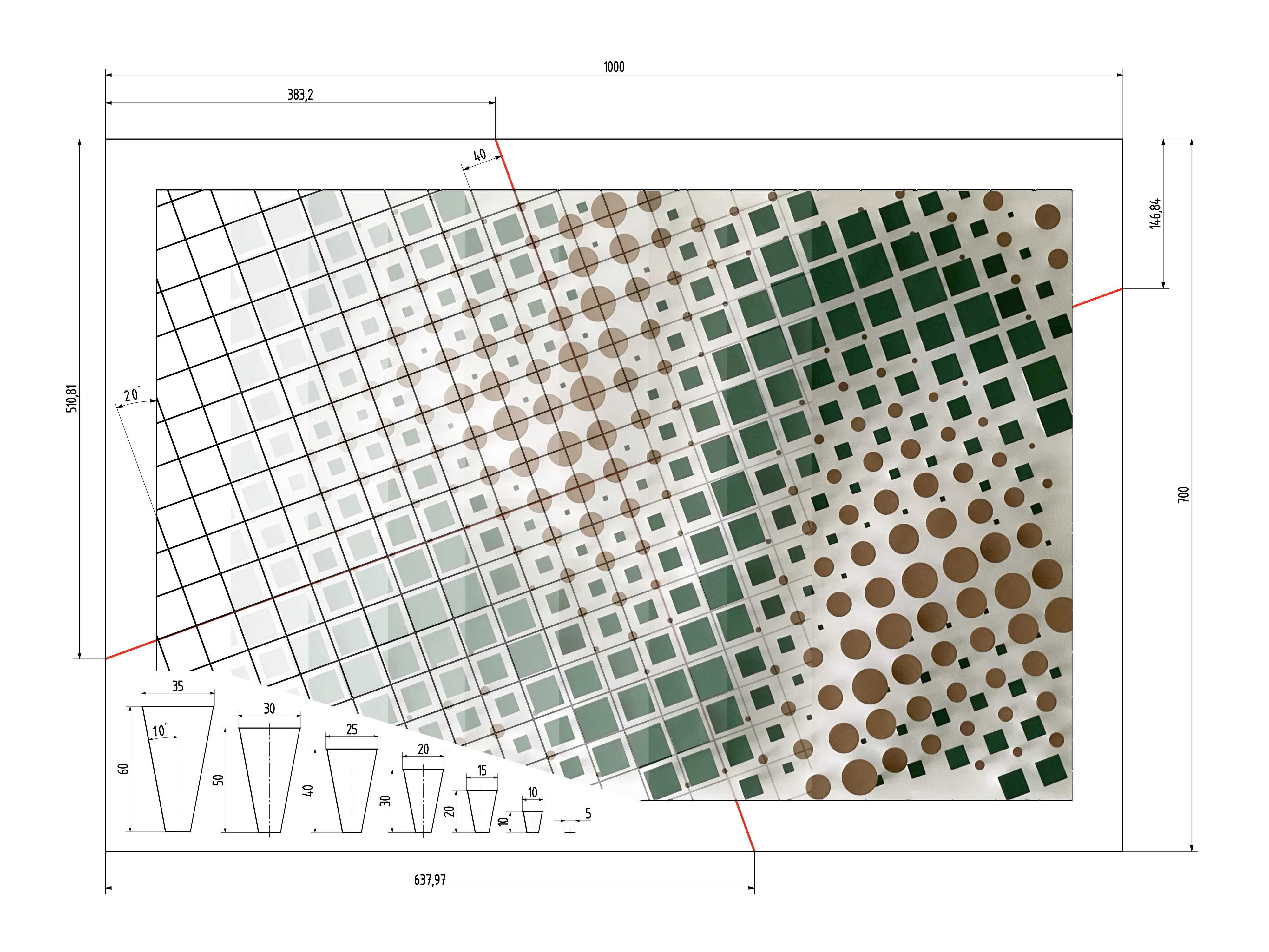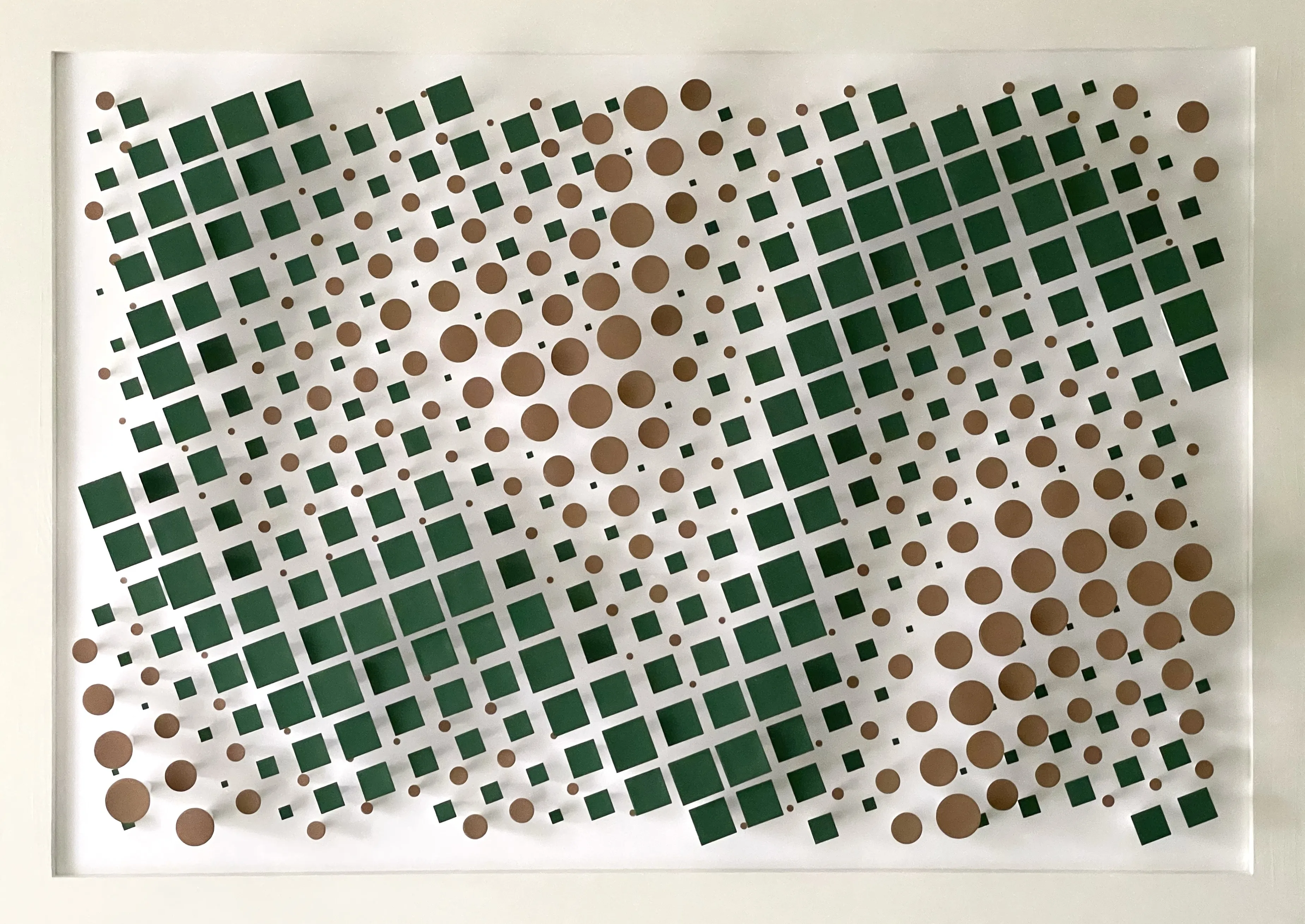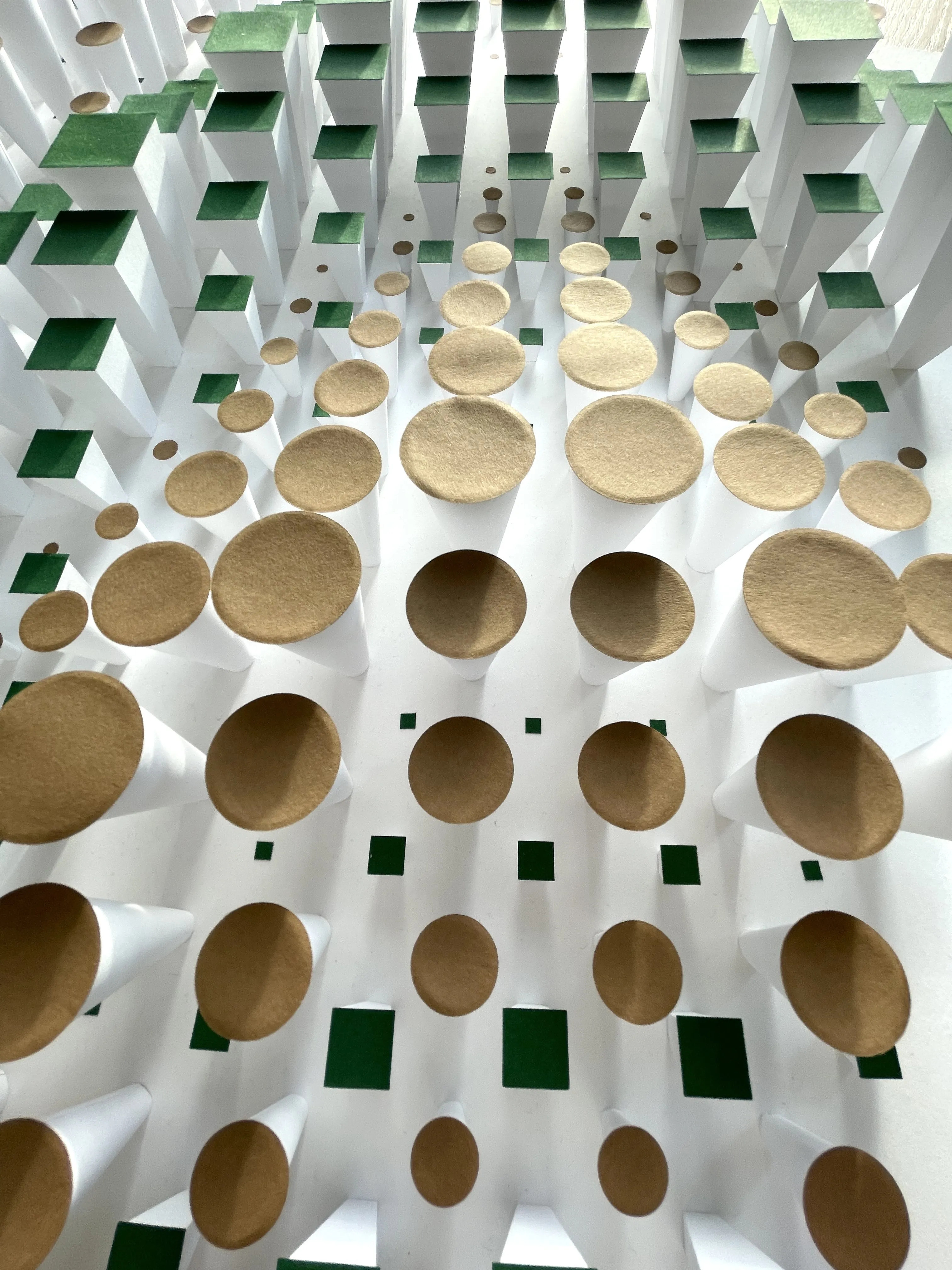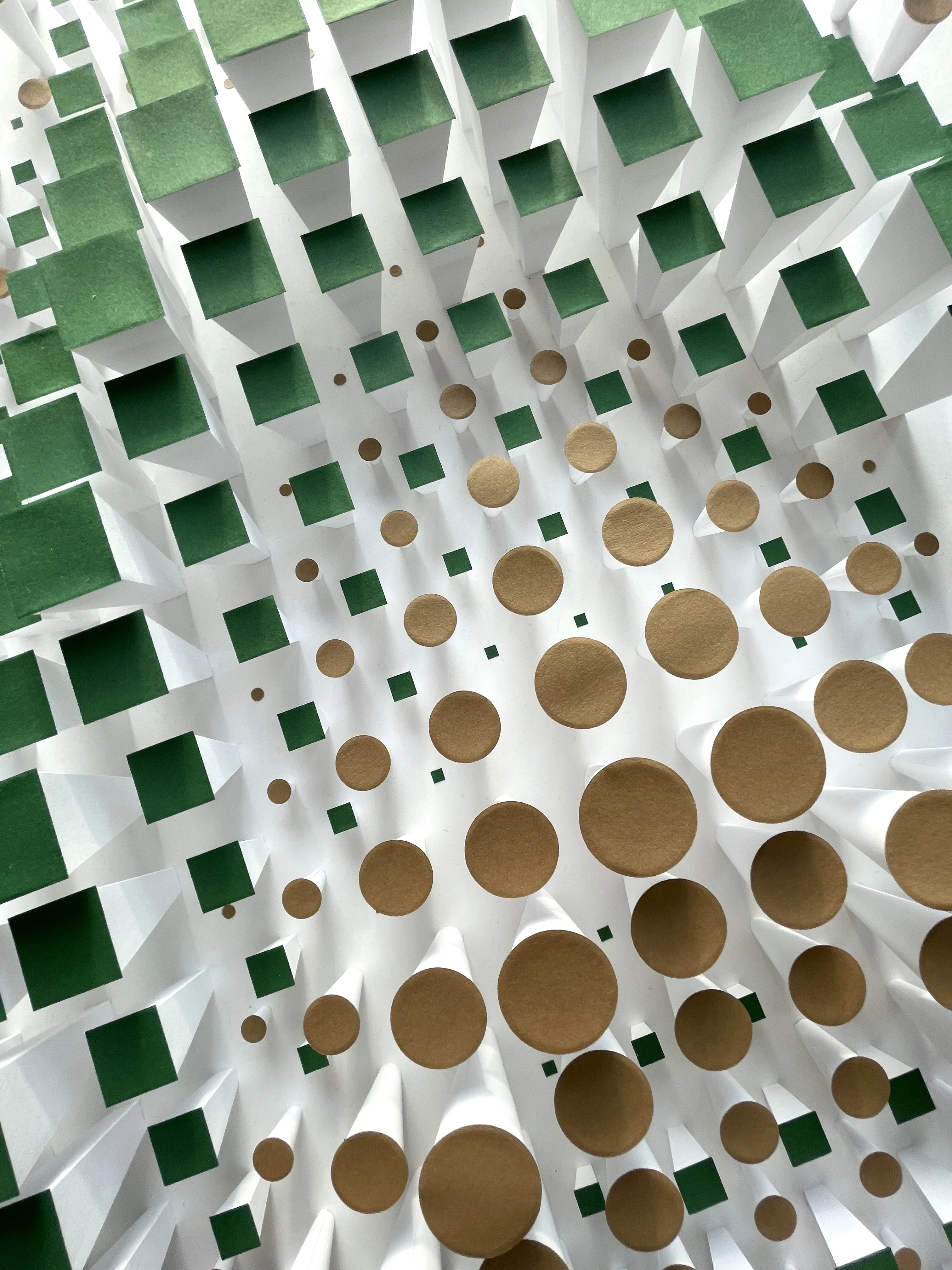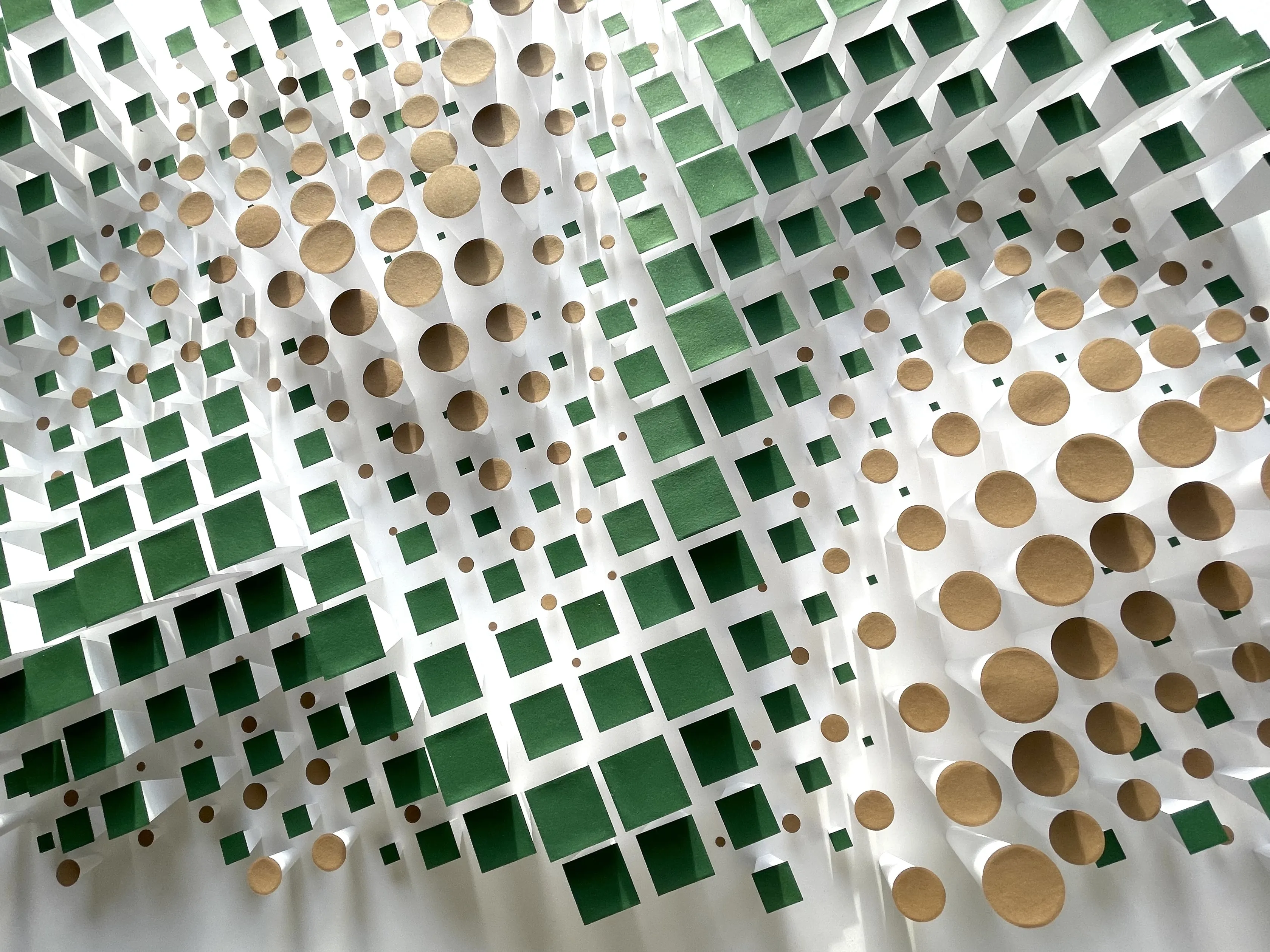 “Sonova” – captures the harmony of sound (Sonus) and forest (Silva) in a pixelated representation. The composition consists of square and circular paper elements arranged in various sizes and heights – like building blocks of nature that follow a subtle but palpable inner logic.