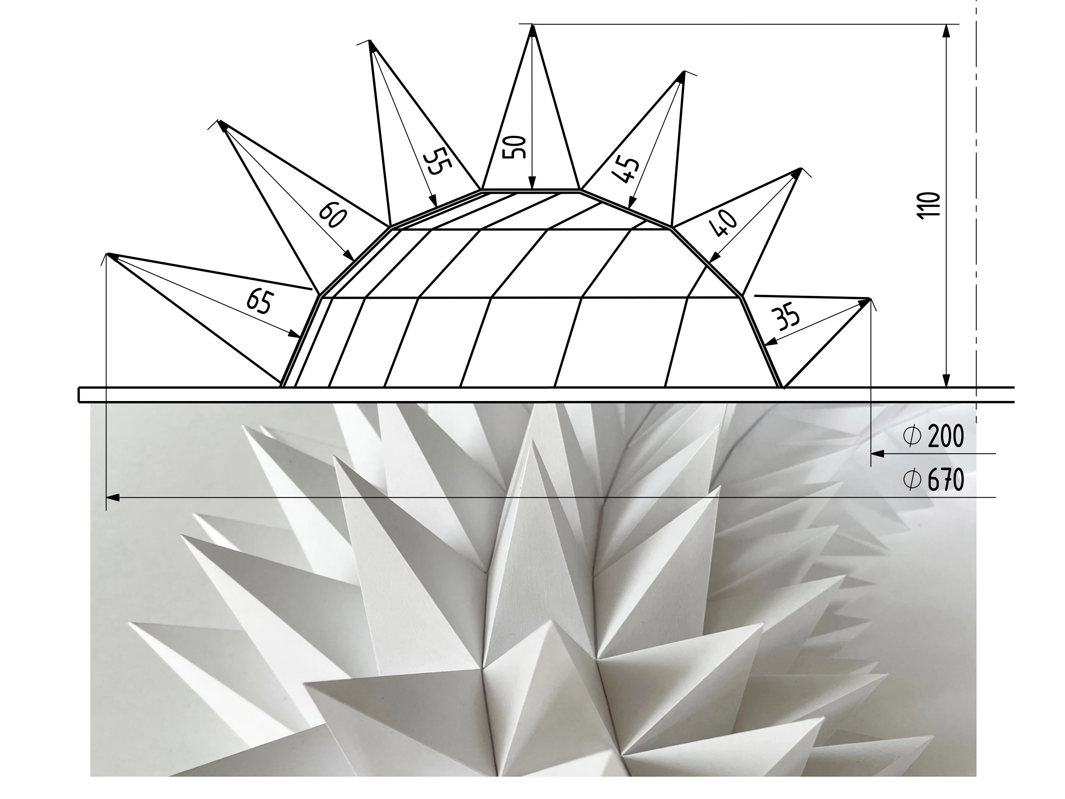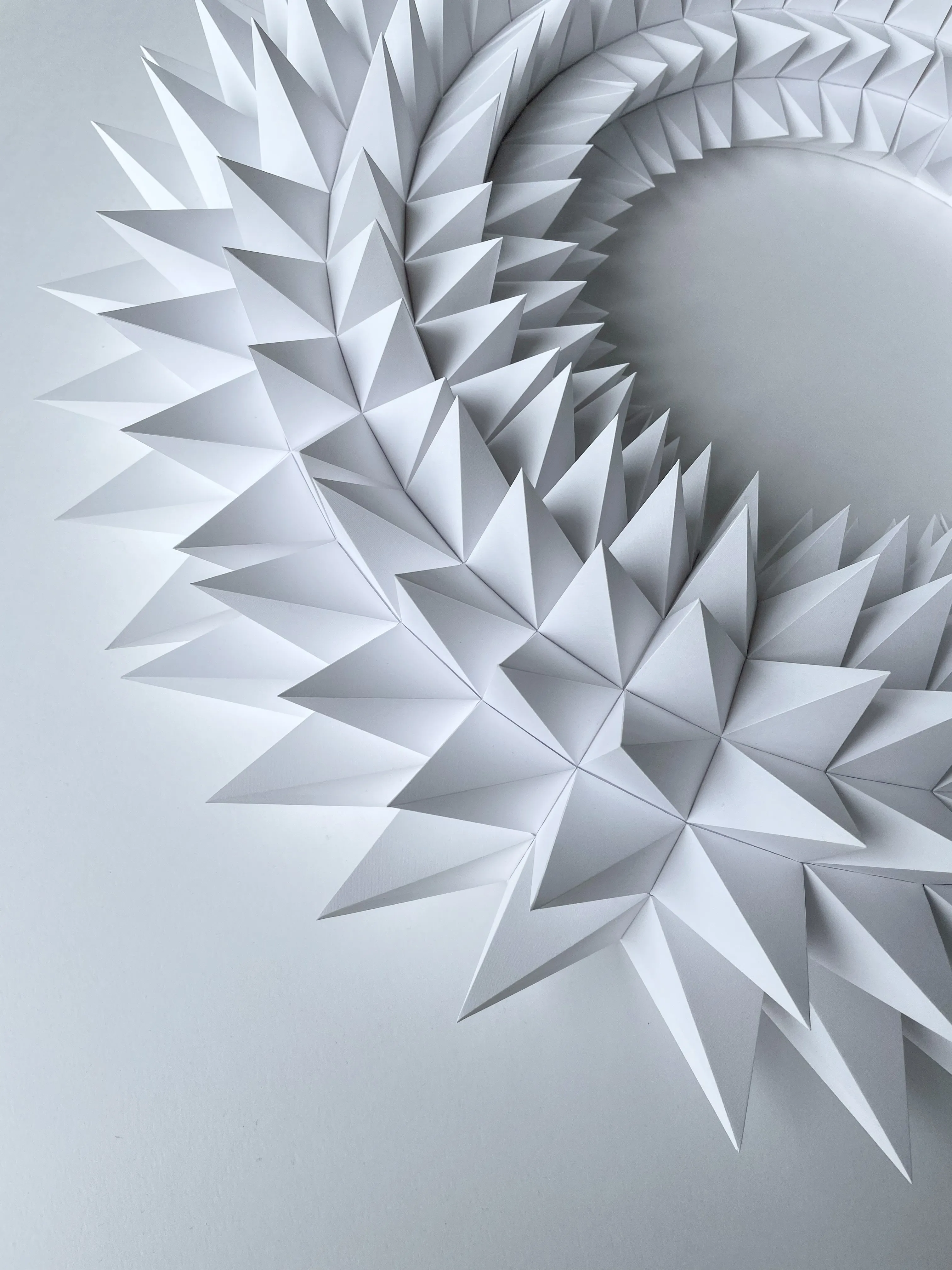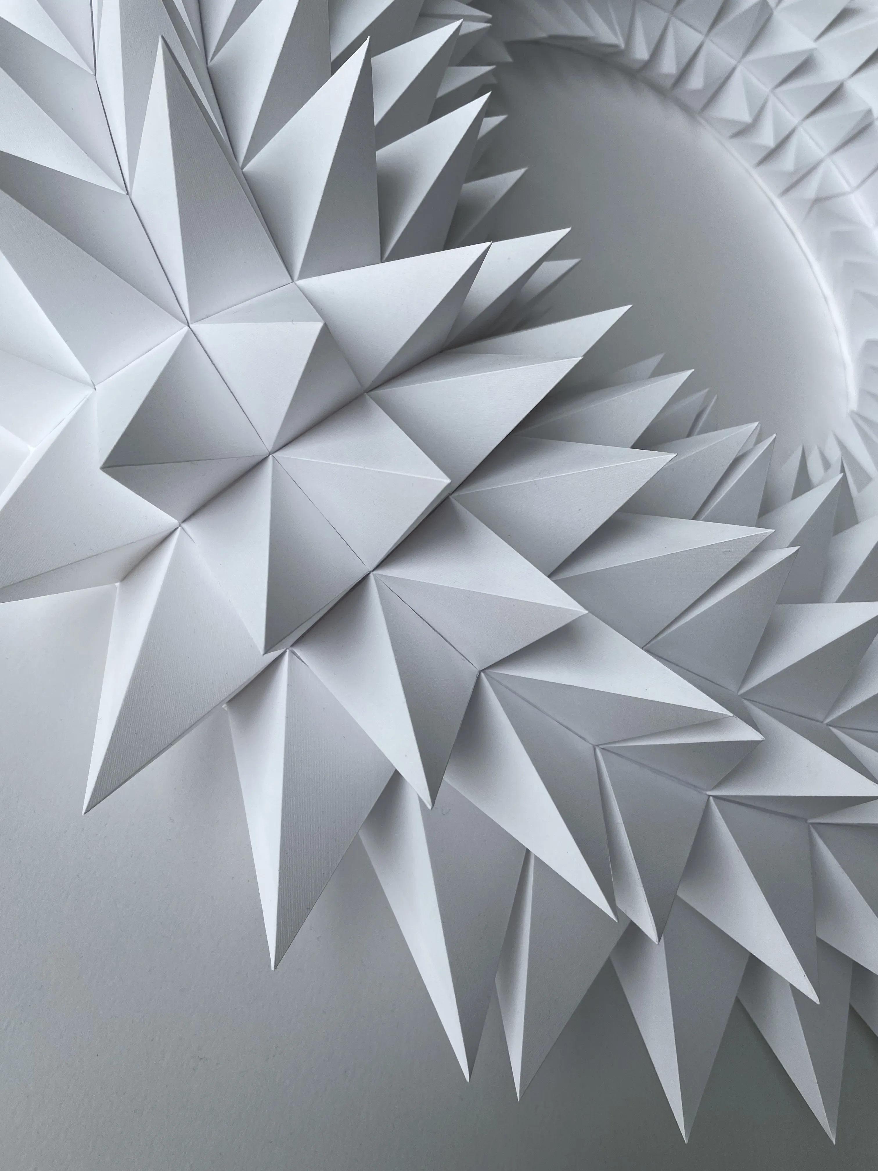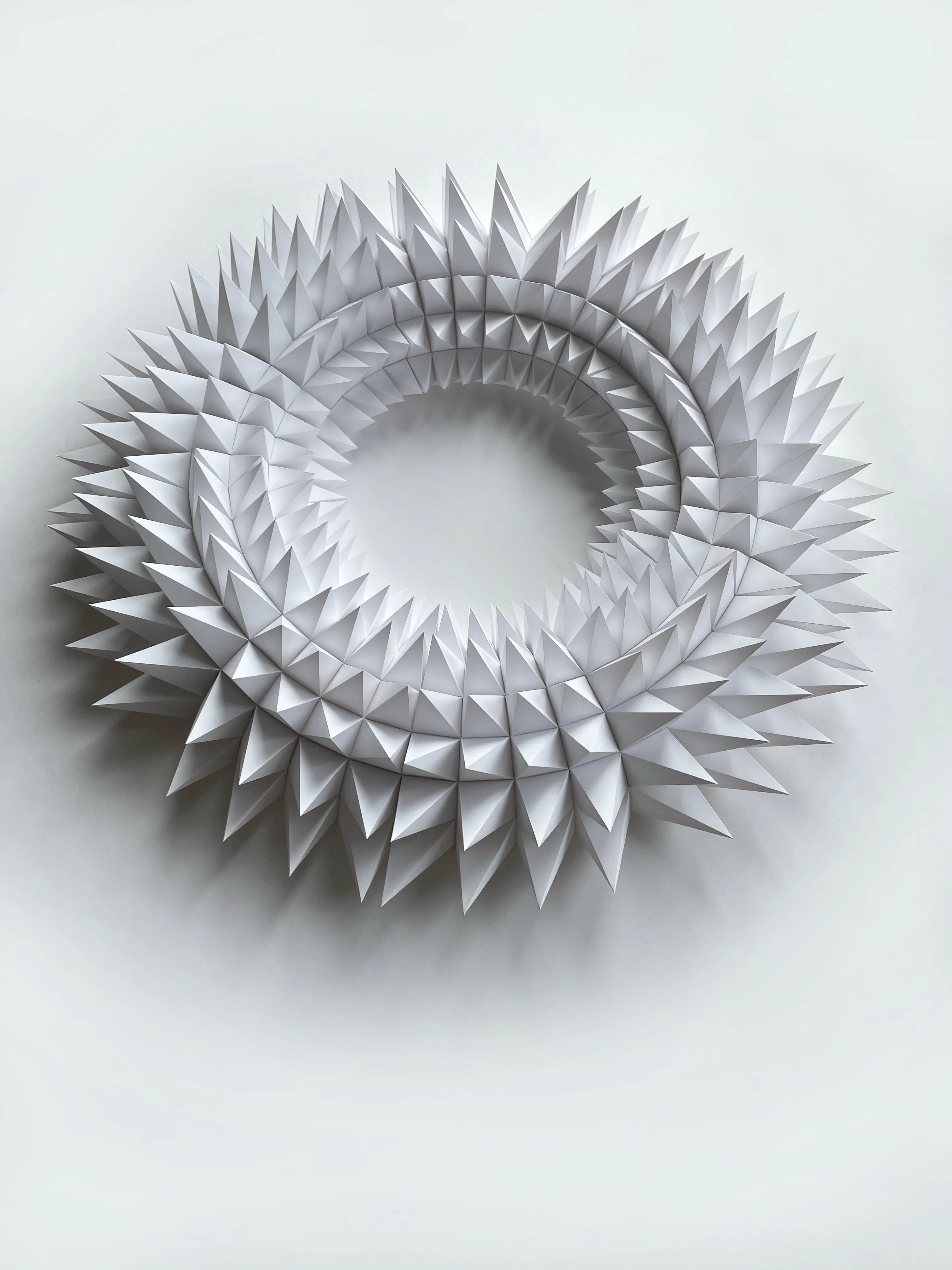 The white coloring enhances the purity and elegance of the design, directing focus to the geometric perfection while playing with light and shadow. It evokes a mandala, the cyclical nature of life and eternity, while the fragility of the paper creates a delicate balance between transience and permanence.