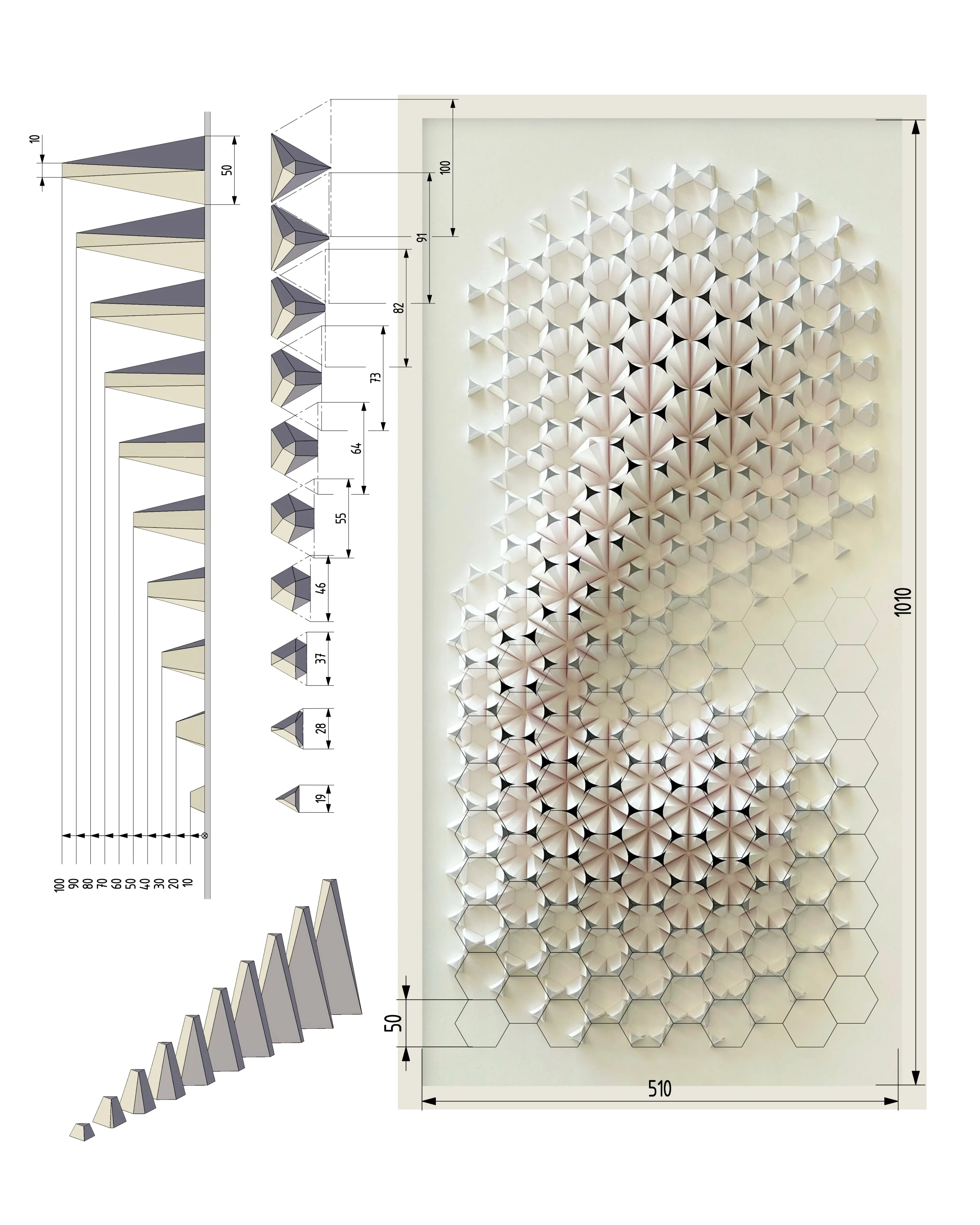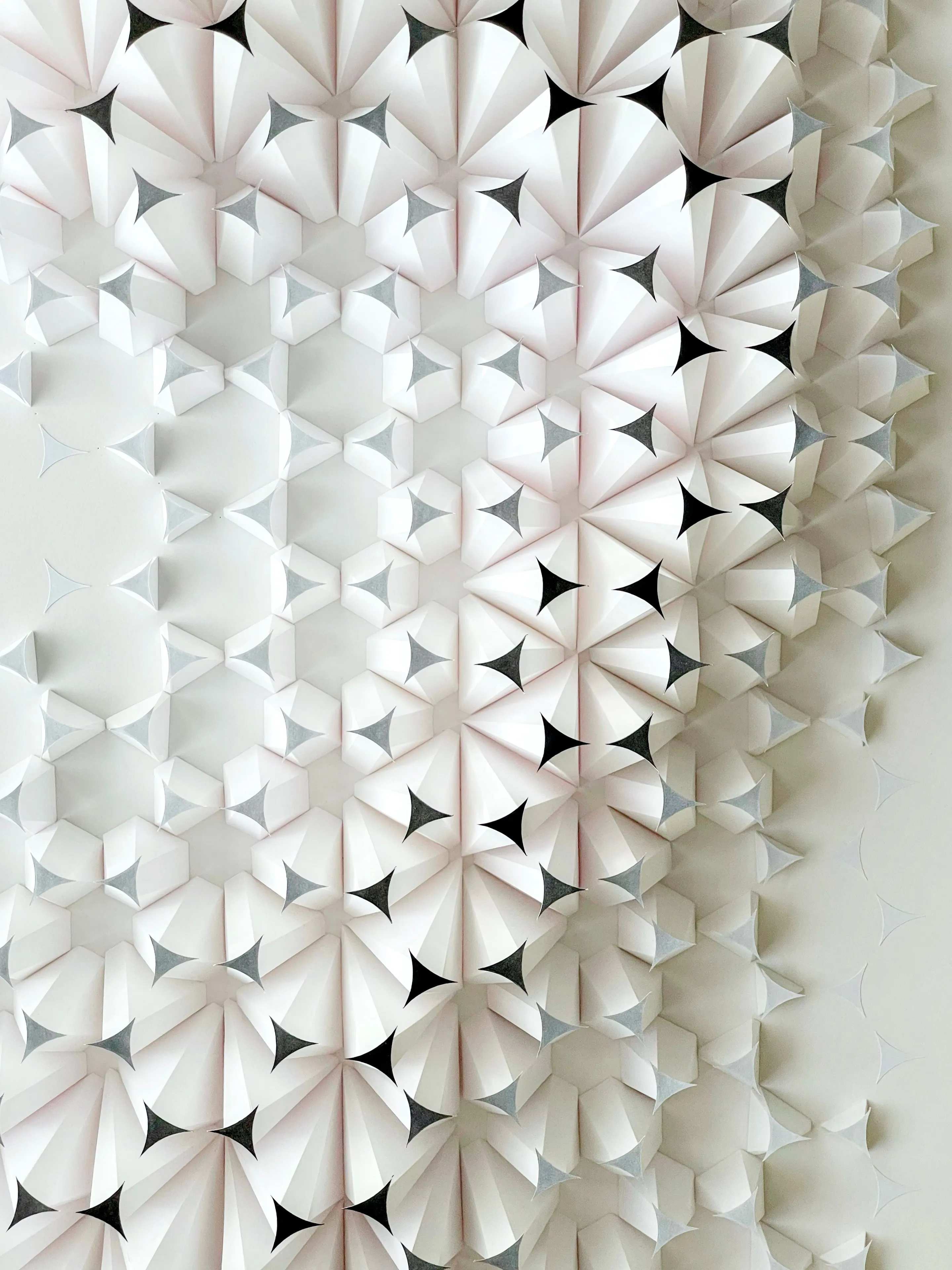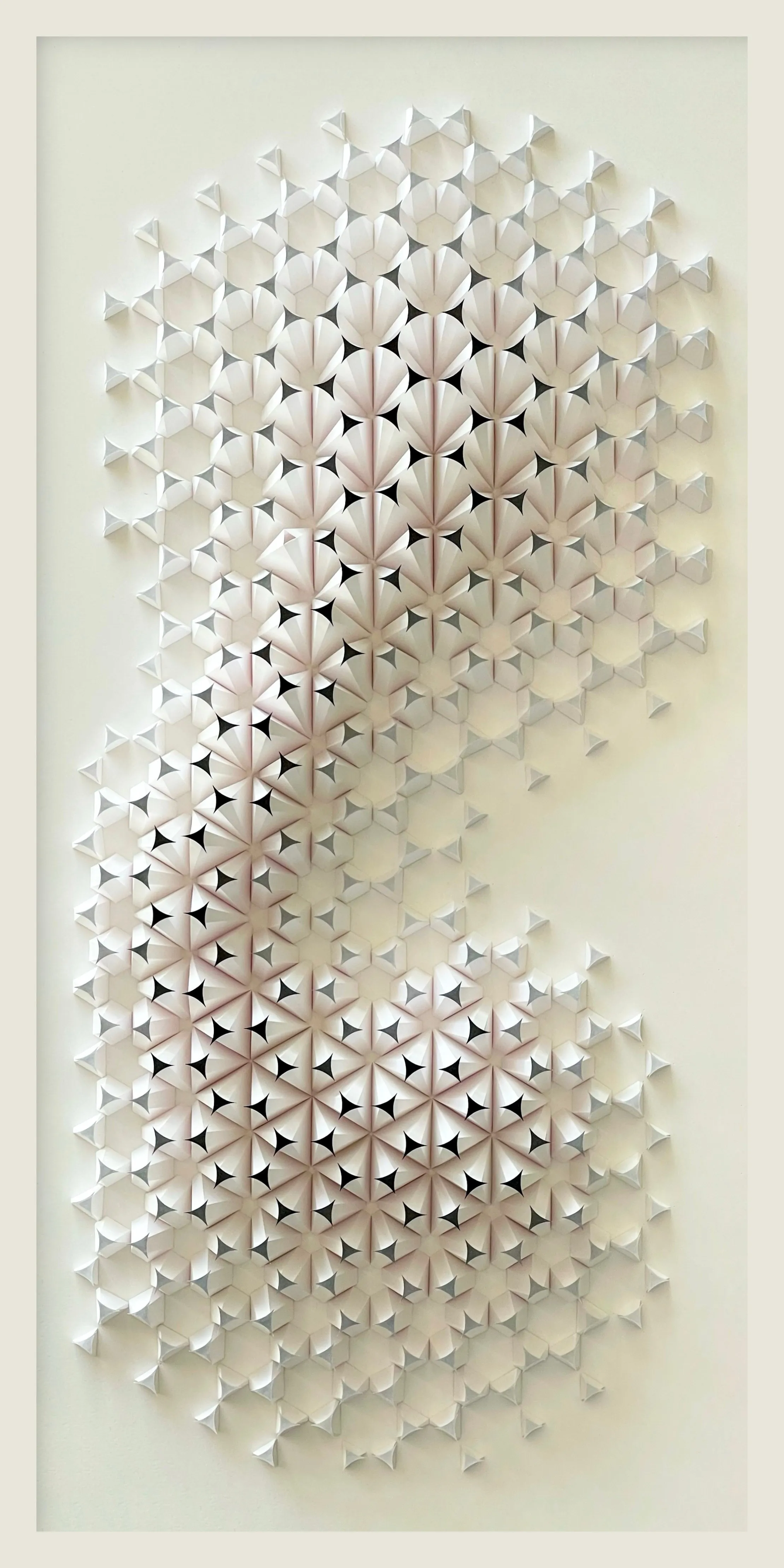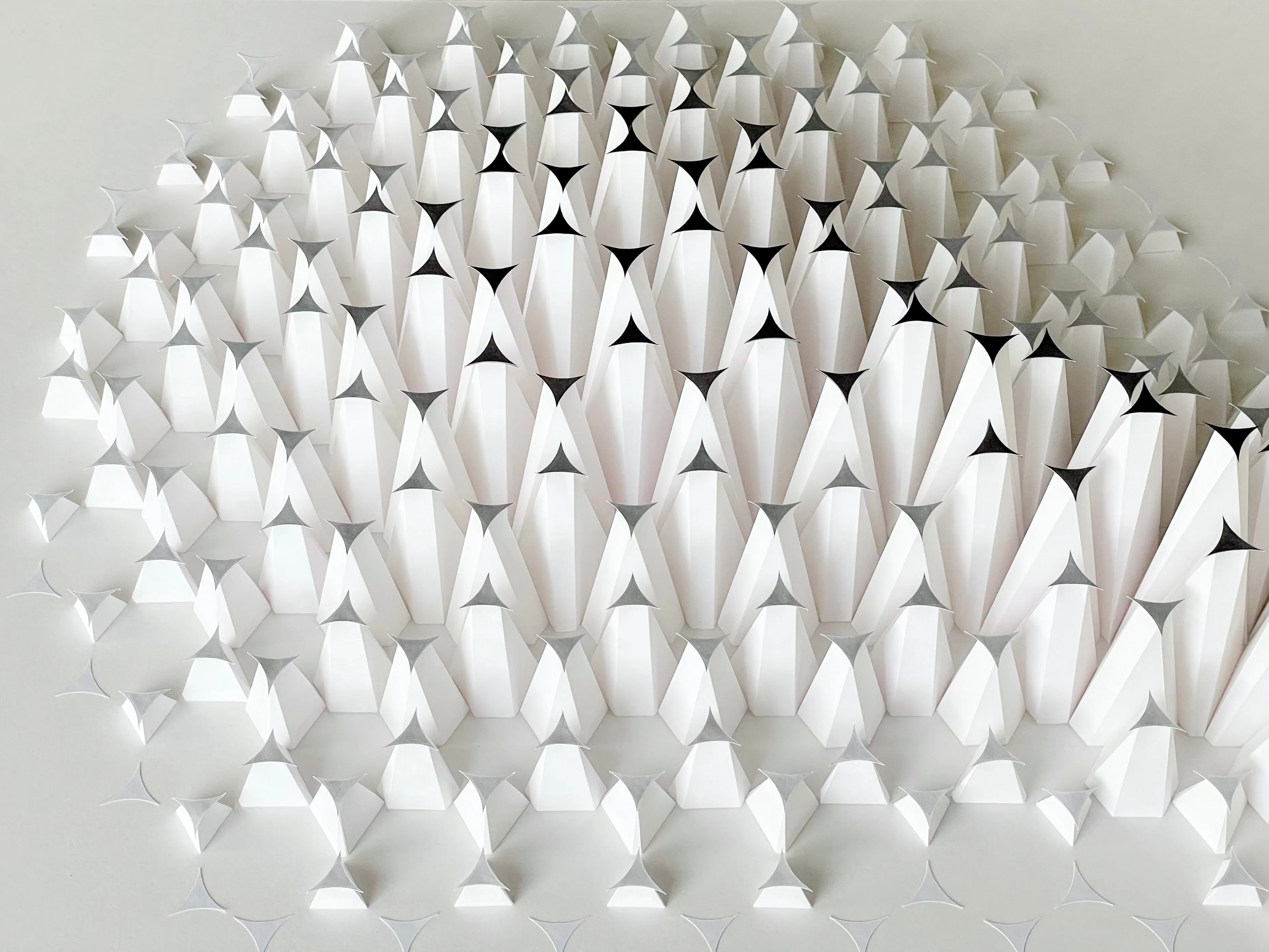 This sculptural paper relief presents an interwoven arrangement of fine, pyramid-like elements. Variations in height, size, and grey tone of the cover plates convey the impression of an organic swarm.