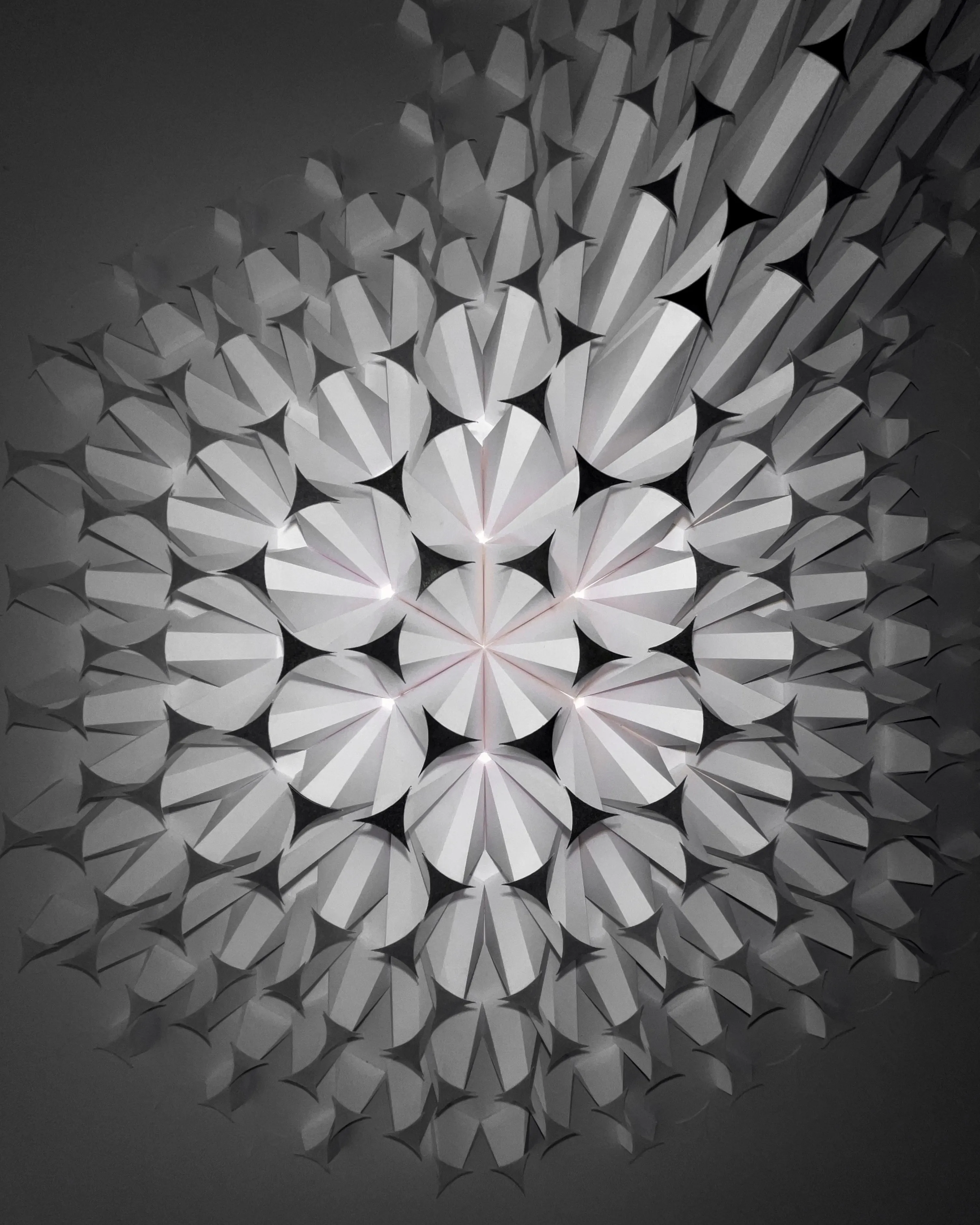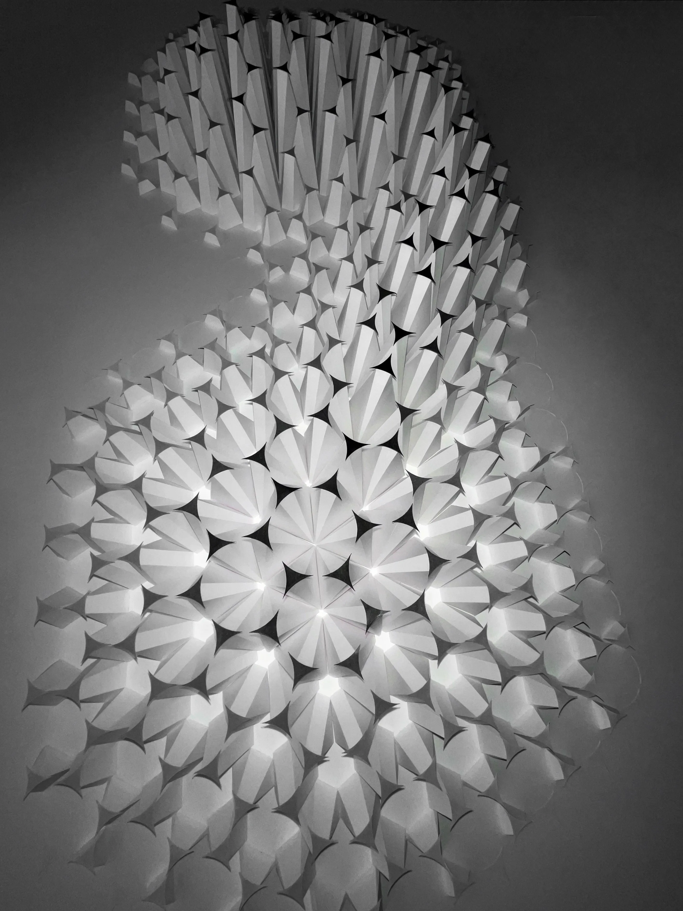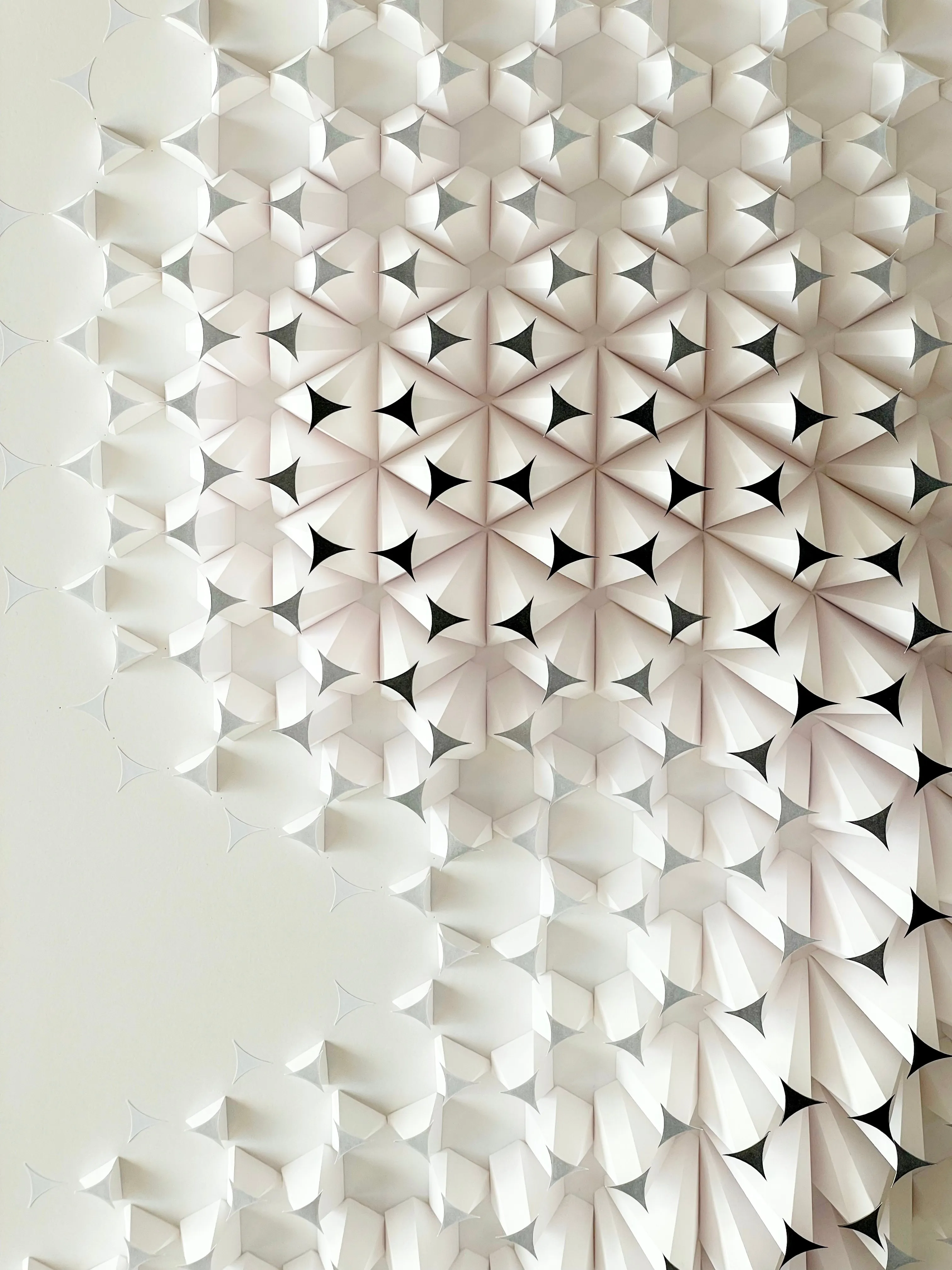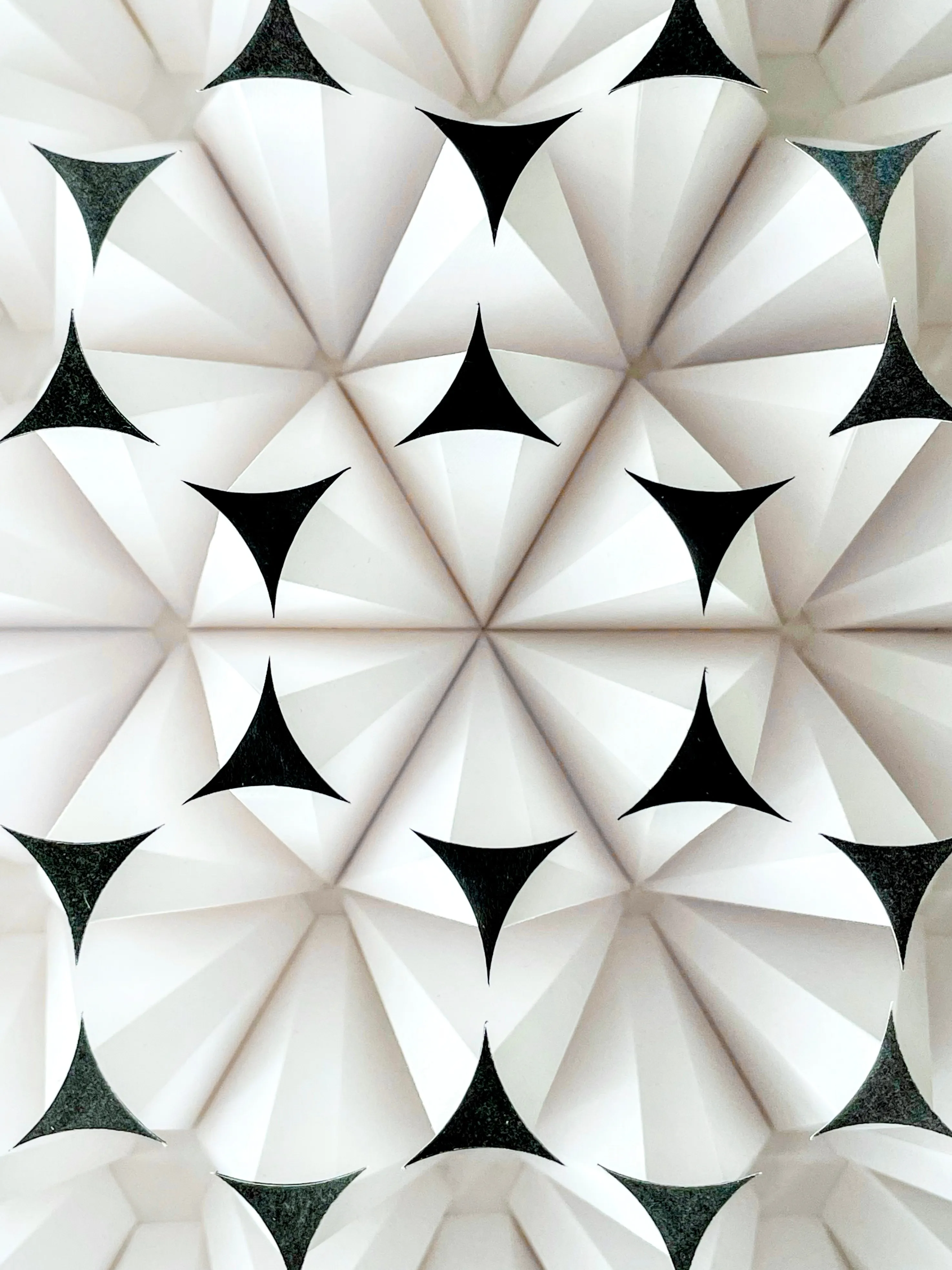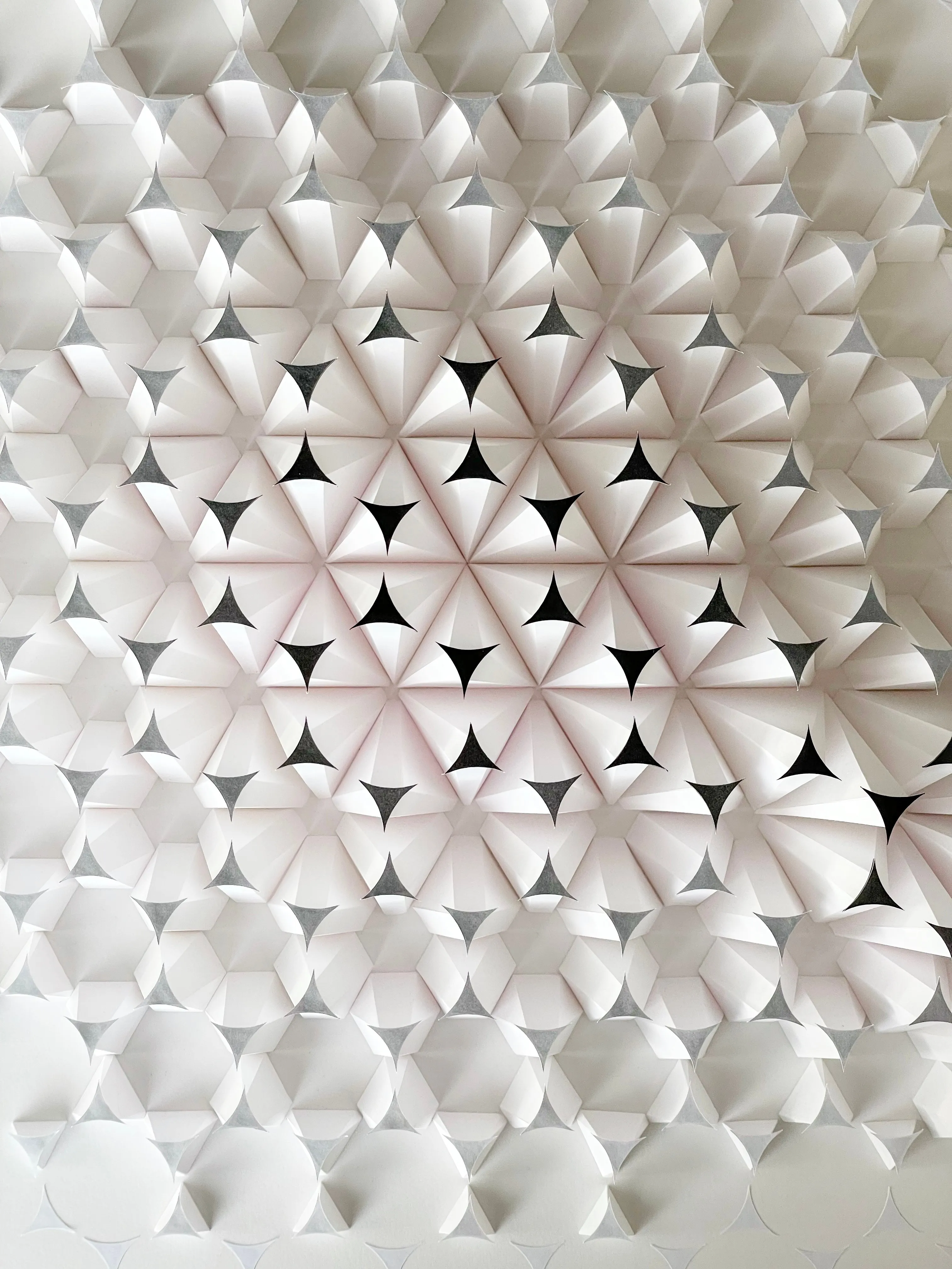 This sculptural paper relief presents an interwoven arrangement of fine, pyramid-like elements. Variations in height, size, and grey tone of the cover plates convey the impression of an organic swarm.