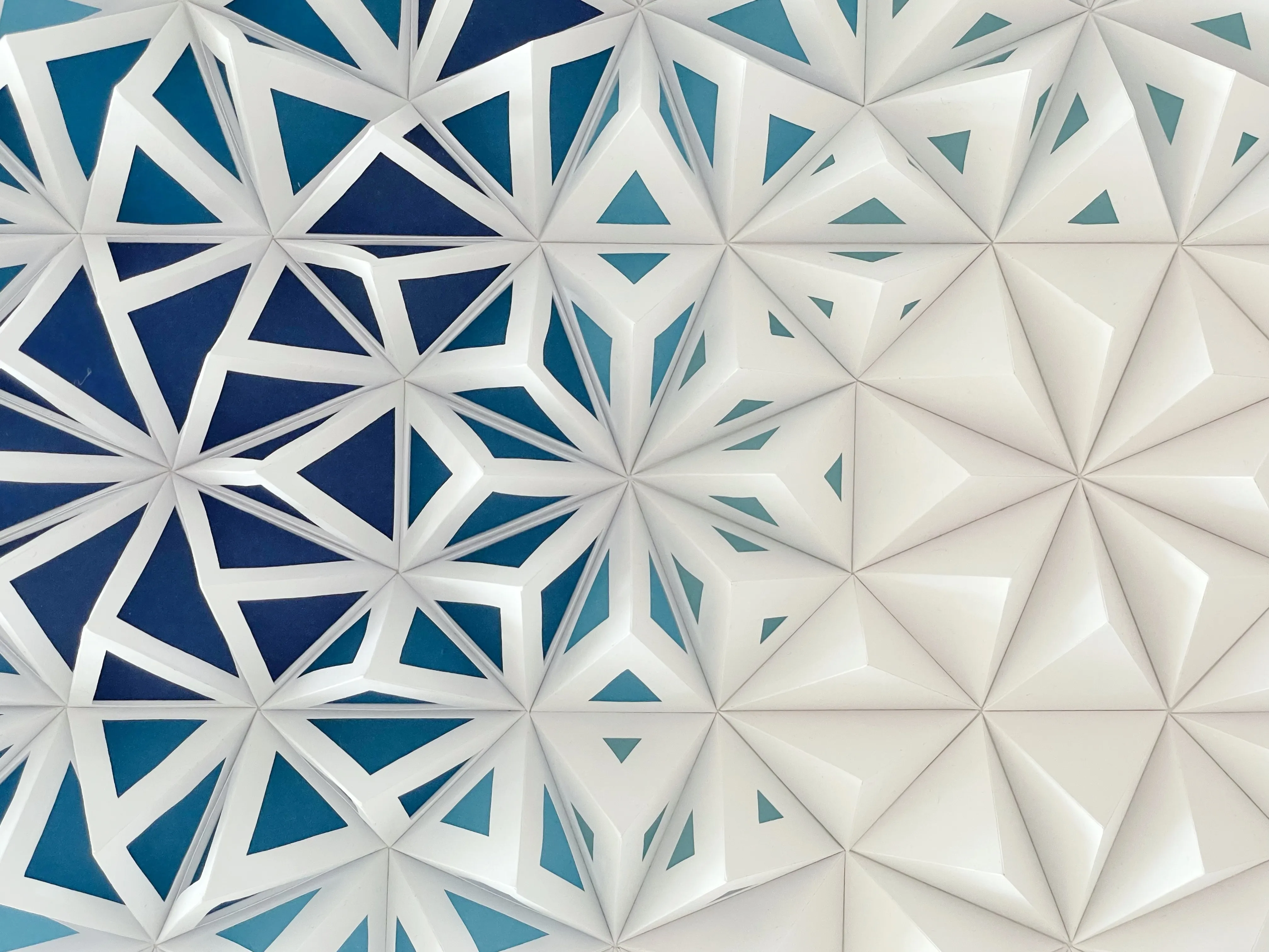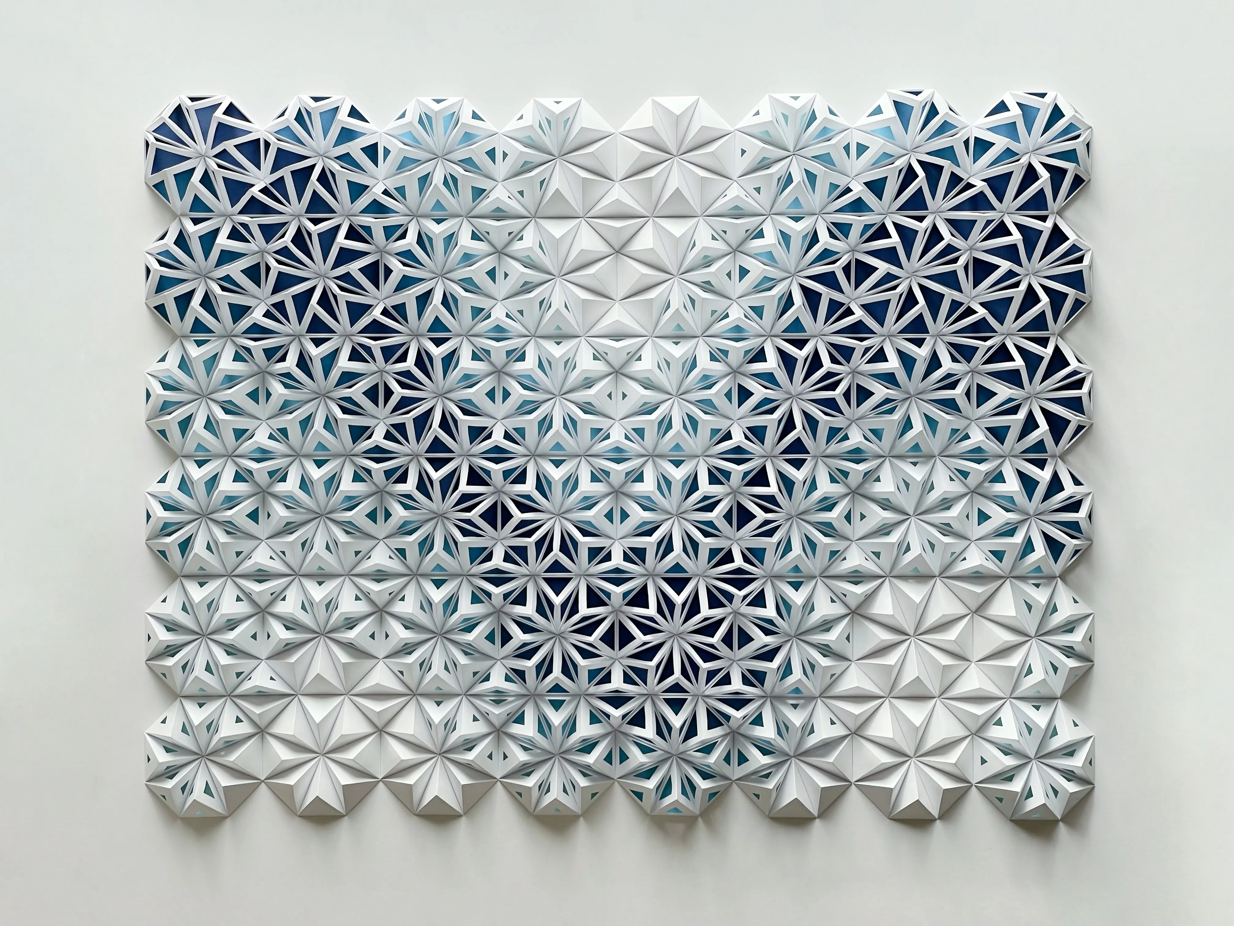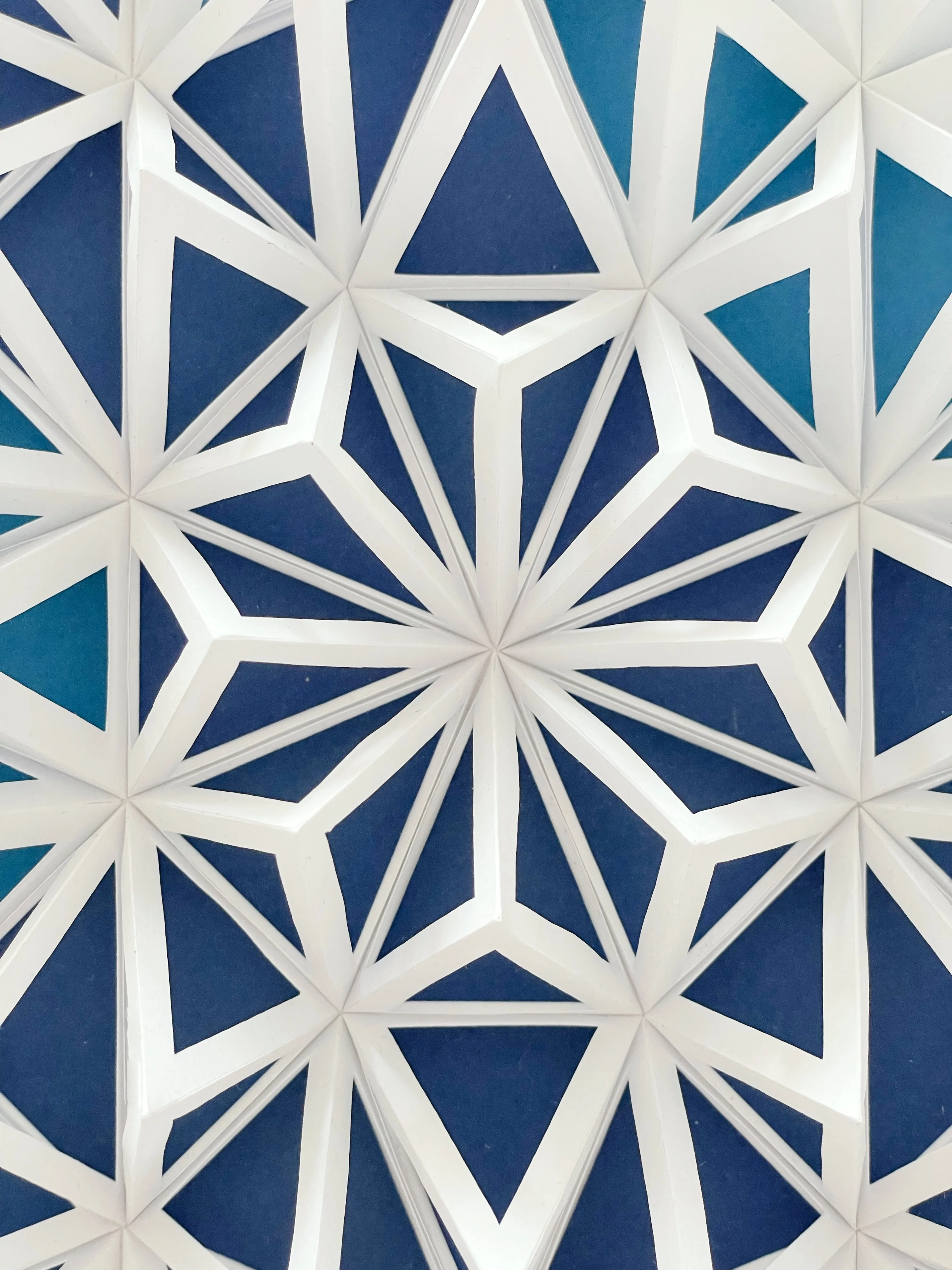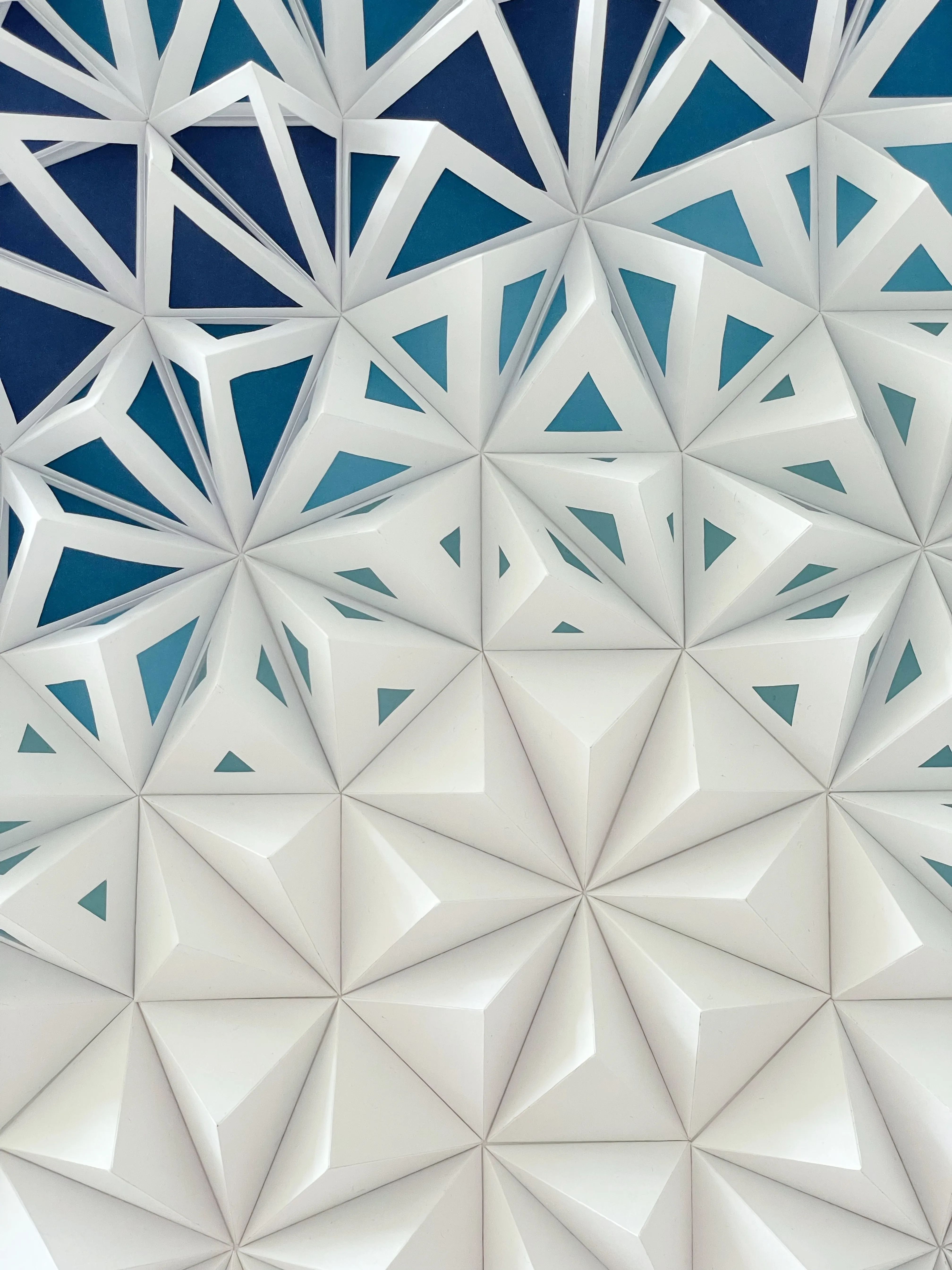 Dieses Werk verbindet klare geometrische Formen mit einem sanften, fließenden Eindruck. Die Struktur wirkt organisch und zugleich streng durchdacht, fast wie eine facettenreiche Oberfläche von Eis oder kristallinen Formen, die langsam in den tiefen, blauen Untergrund zu fließen scheinen.