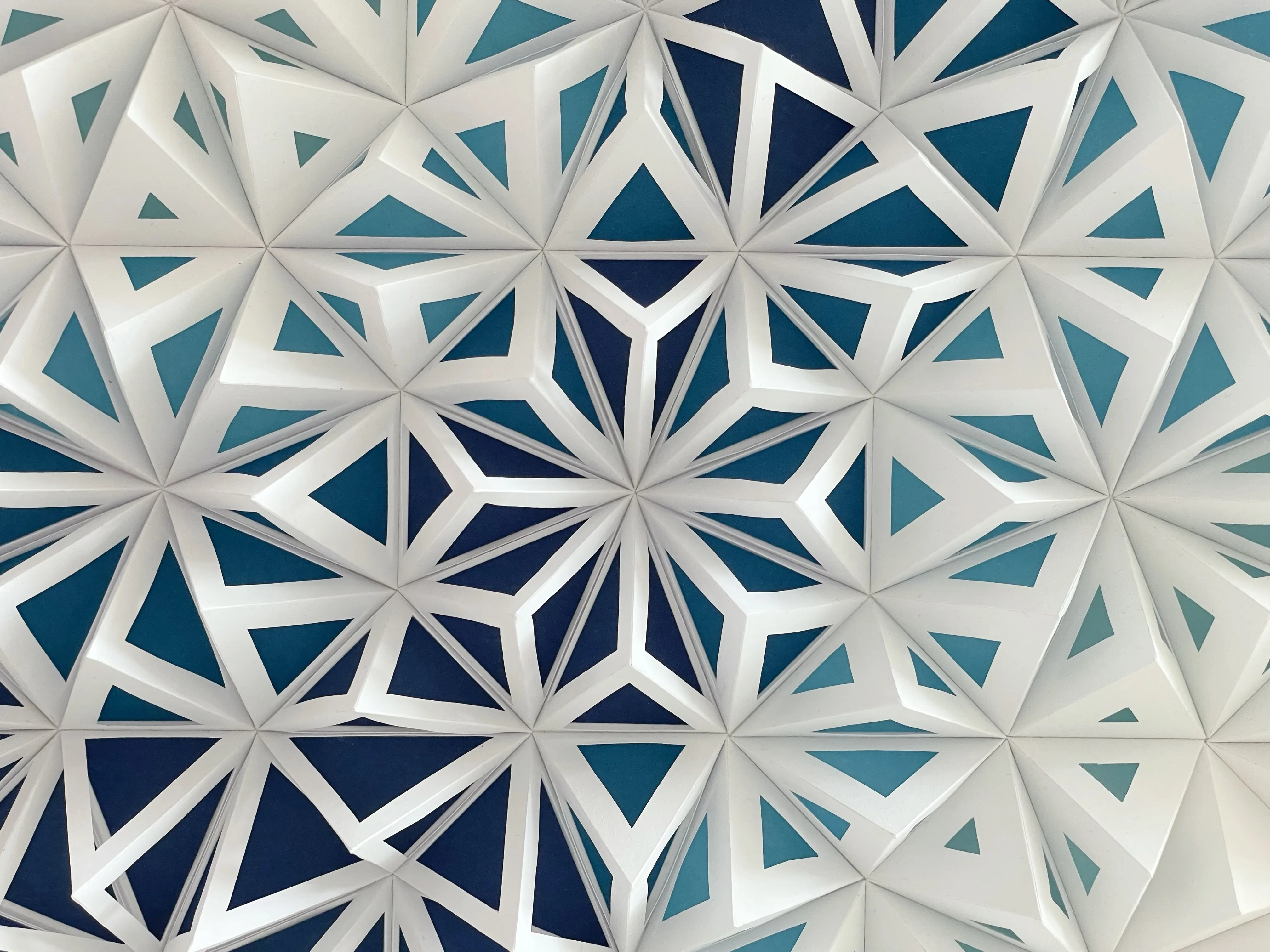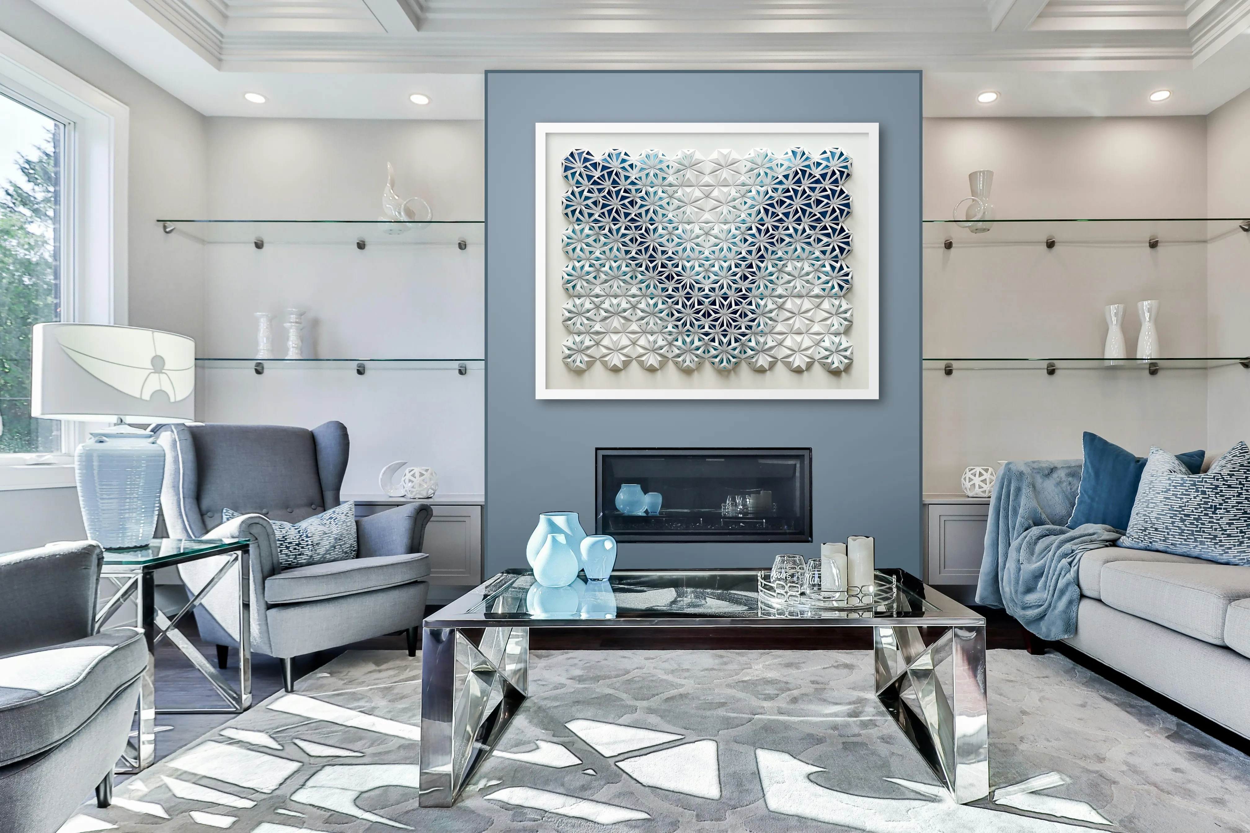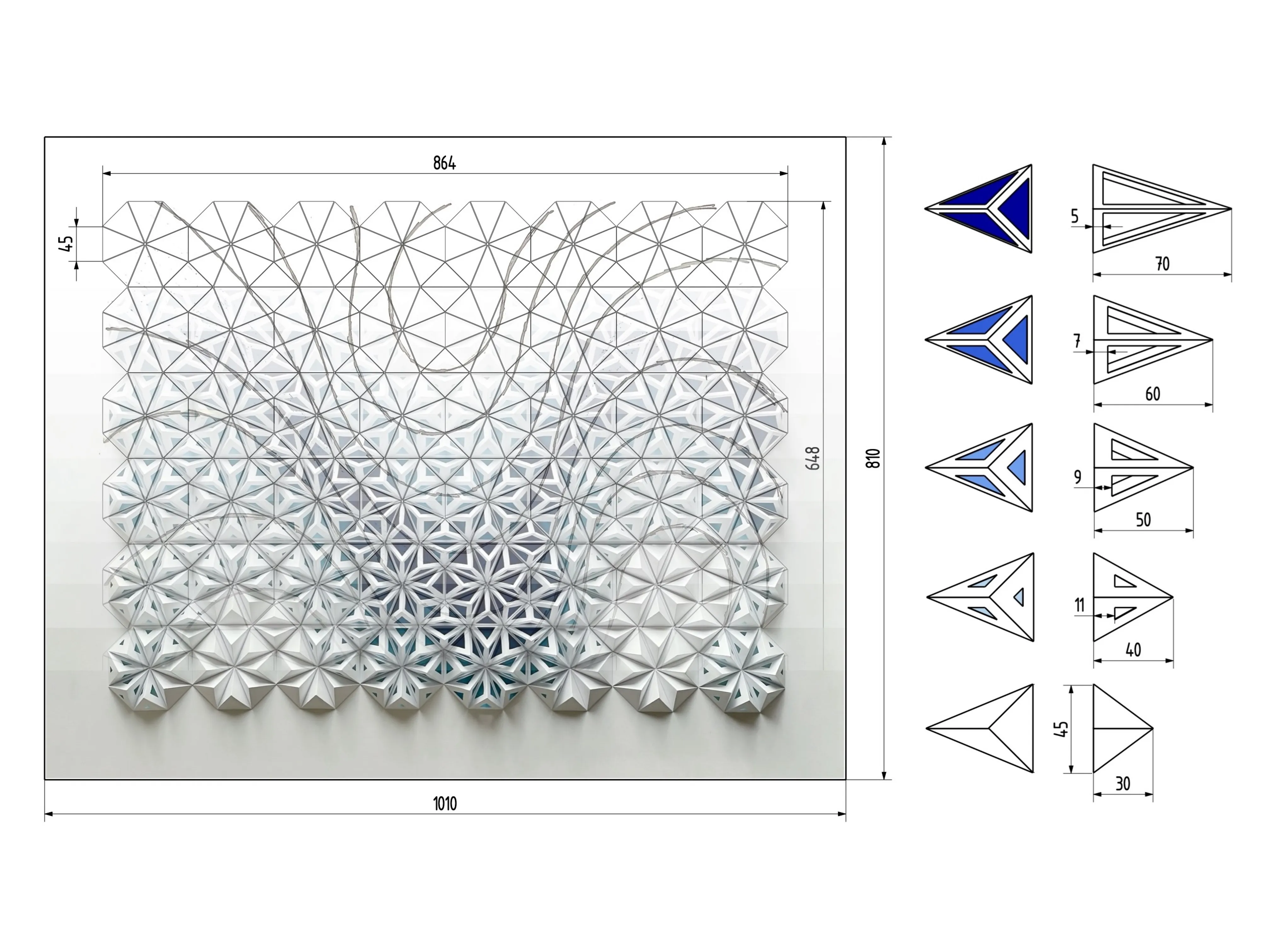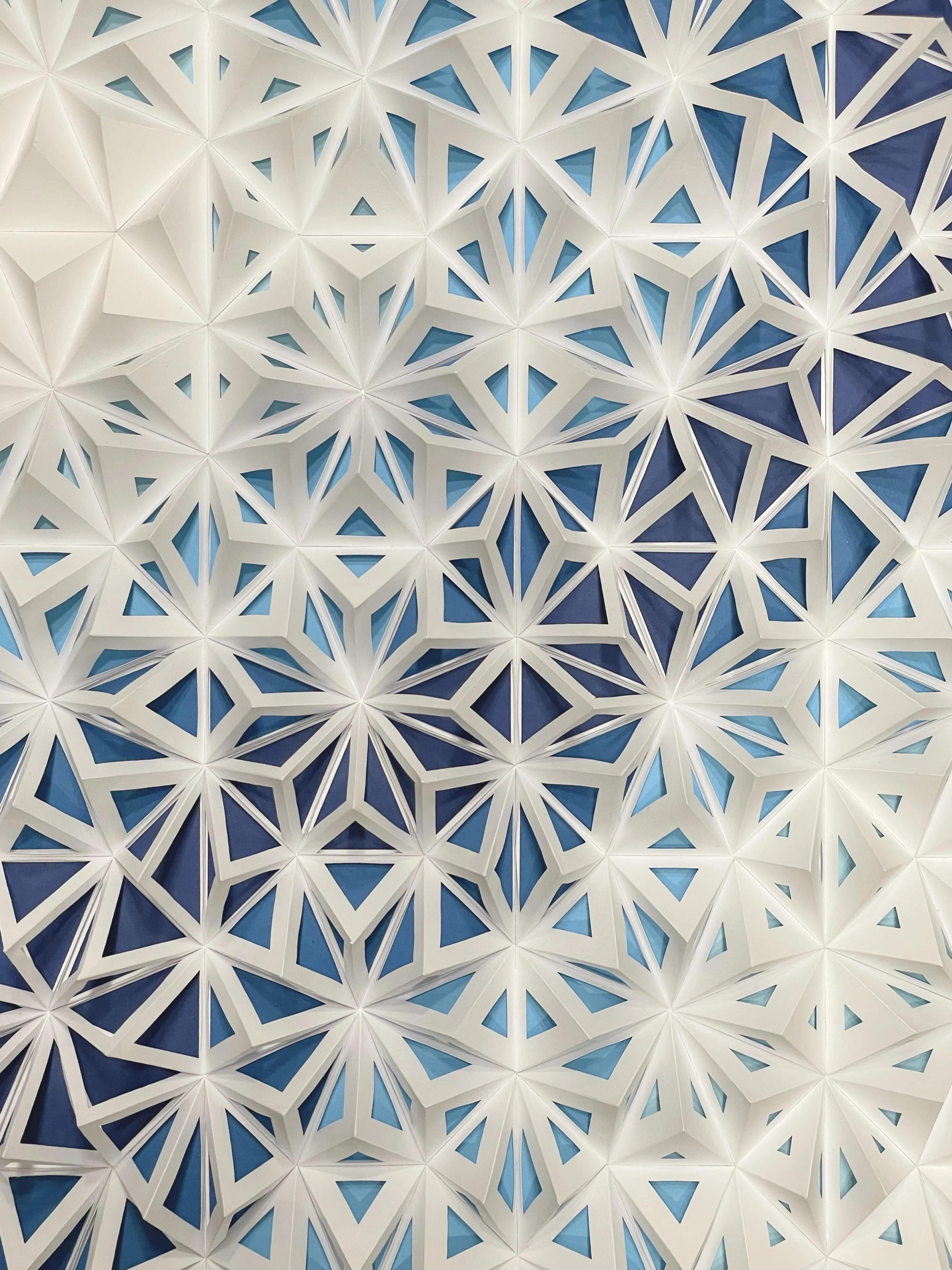 Dieses Werk verbindet klare geometrische Formen mit einem sanften, fließenden Eindruck. Die Struktur wirkt organisch und zugleich streng durchdacht, fast wie eine facettenreiche Oberfläche von Eis oder kristallinen Formen, die langsam in den tiefen, blauen Untergrund zu fließen scheinen.