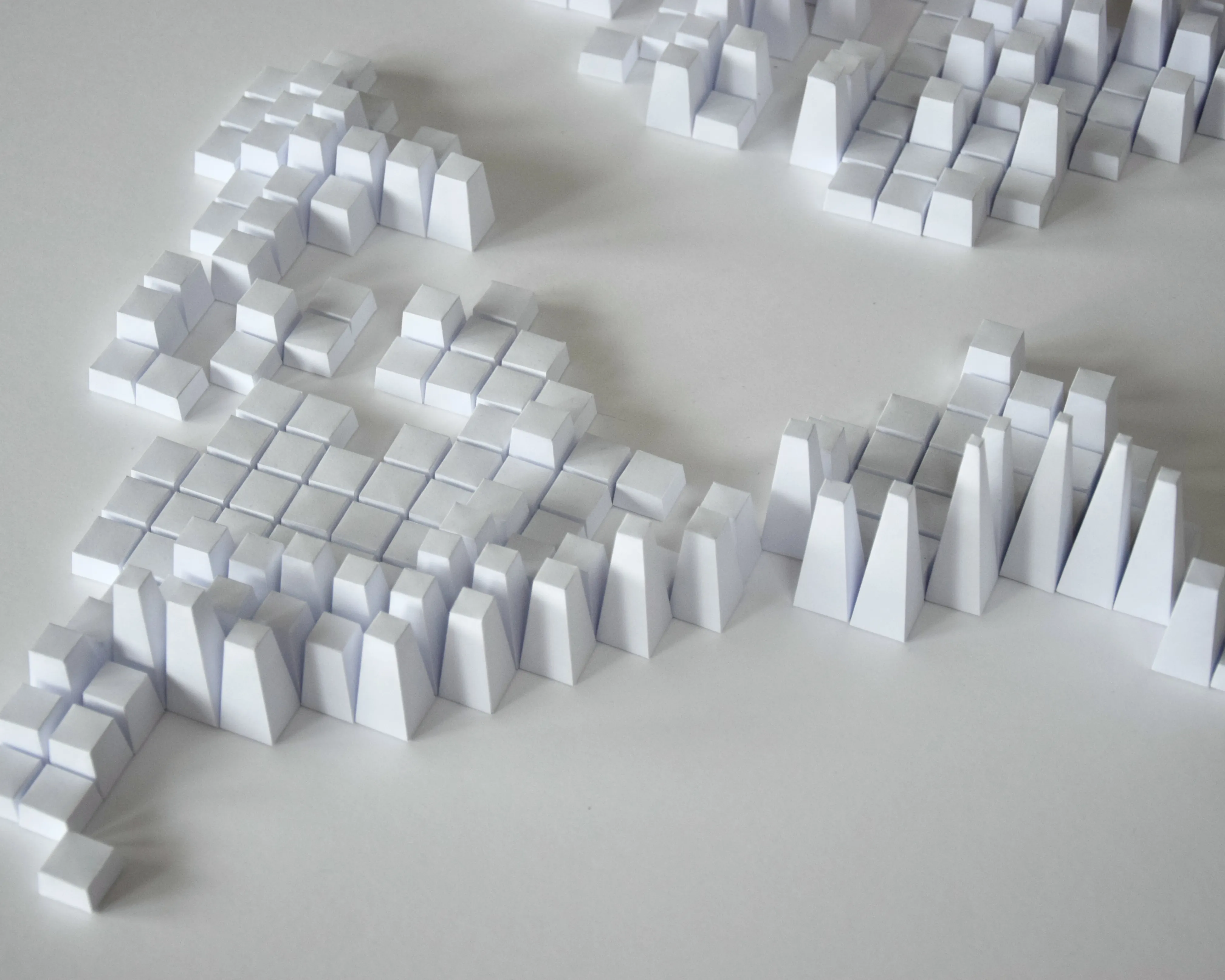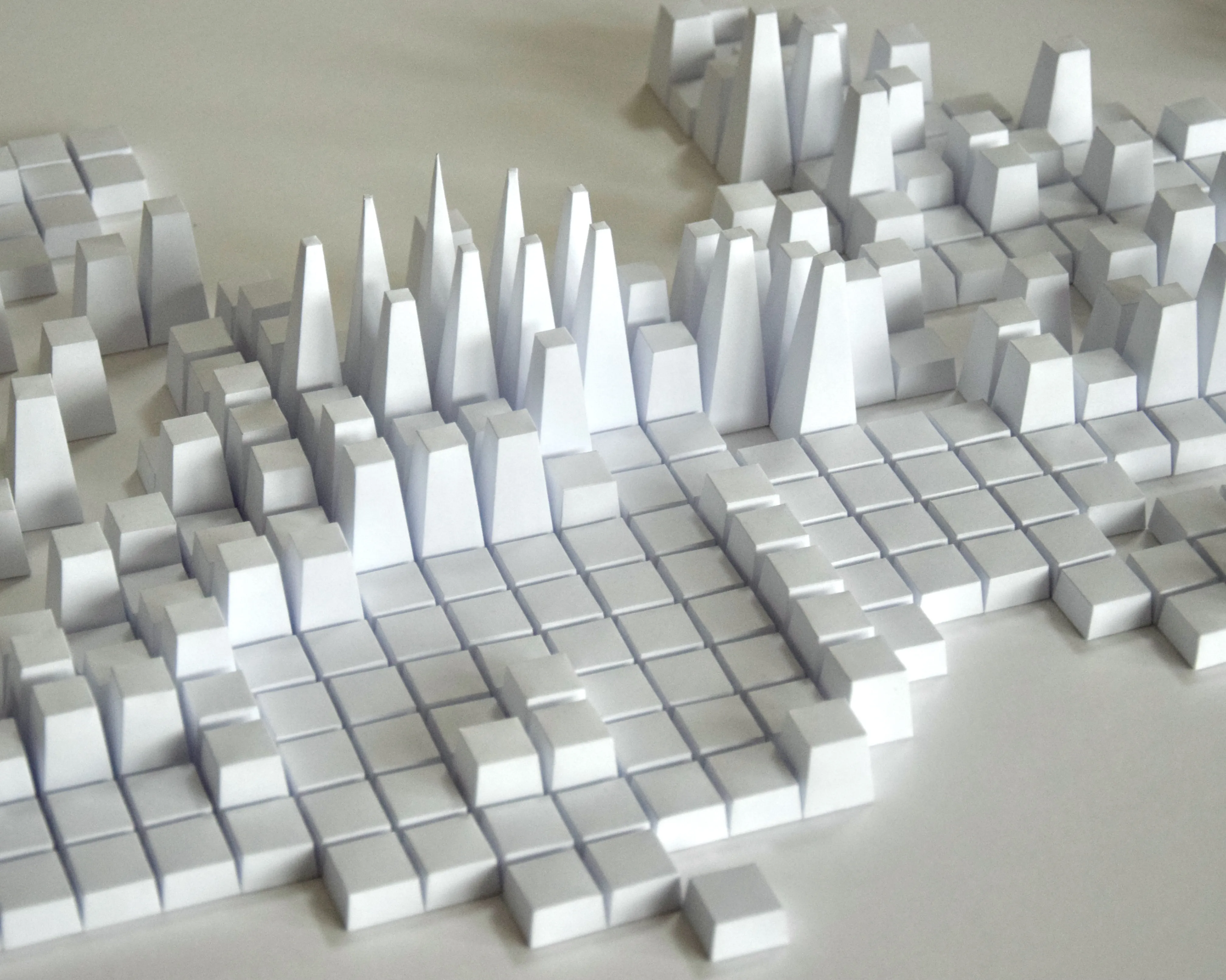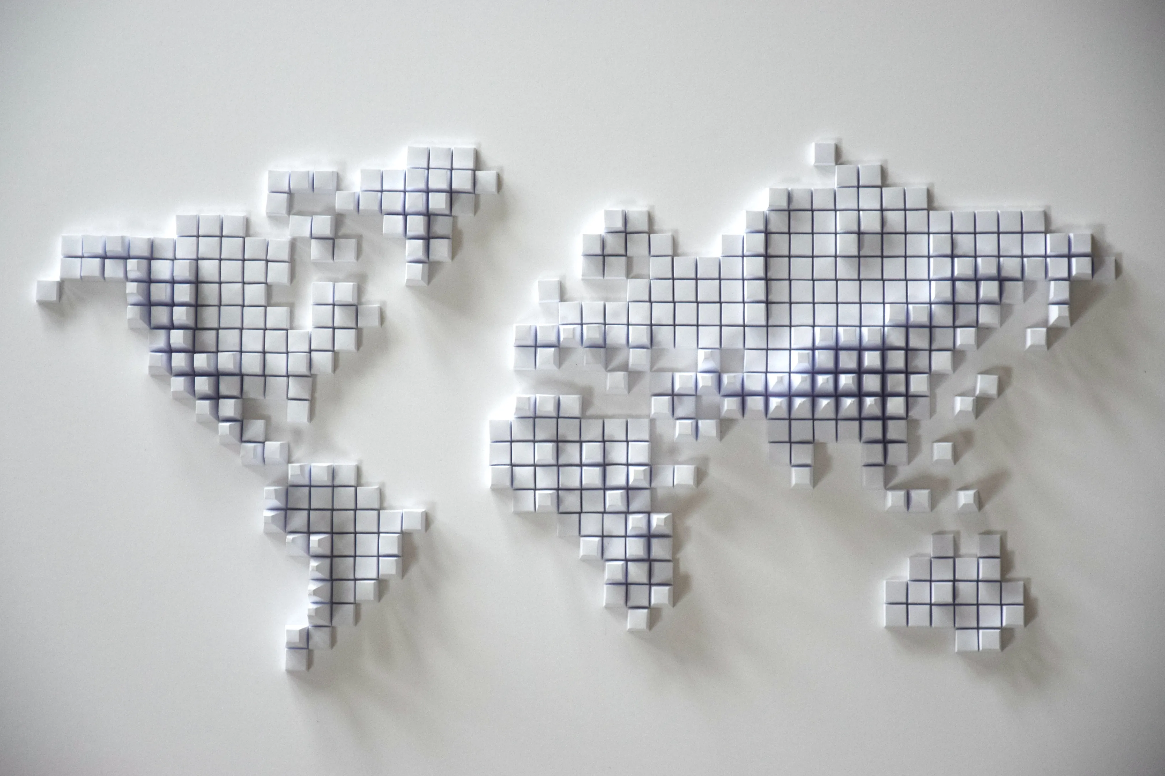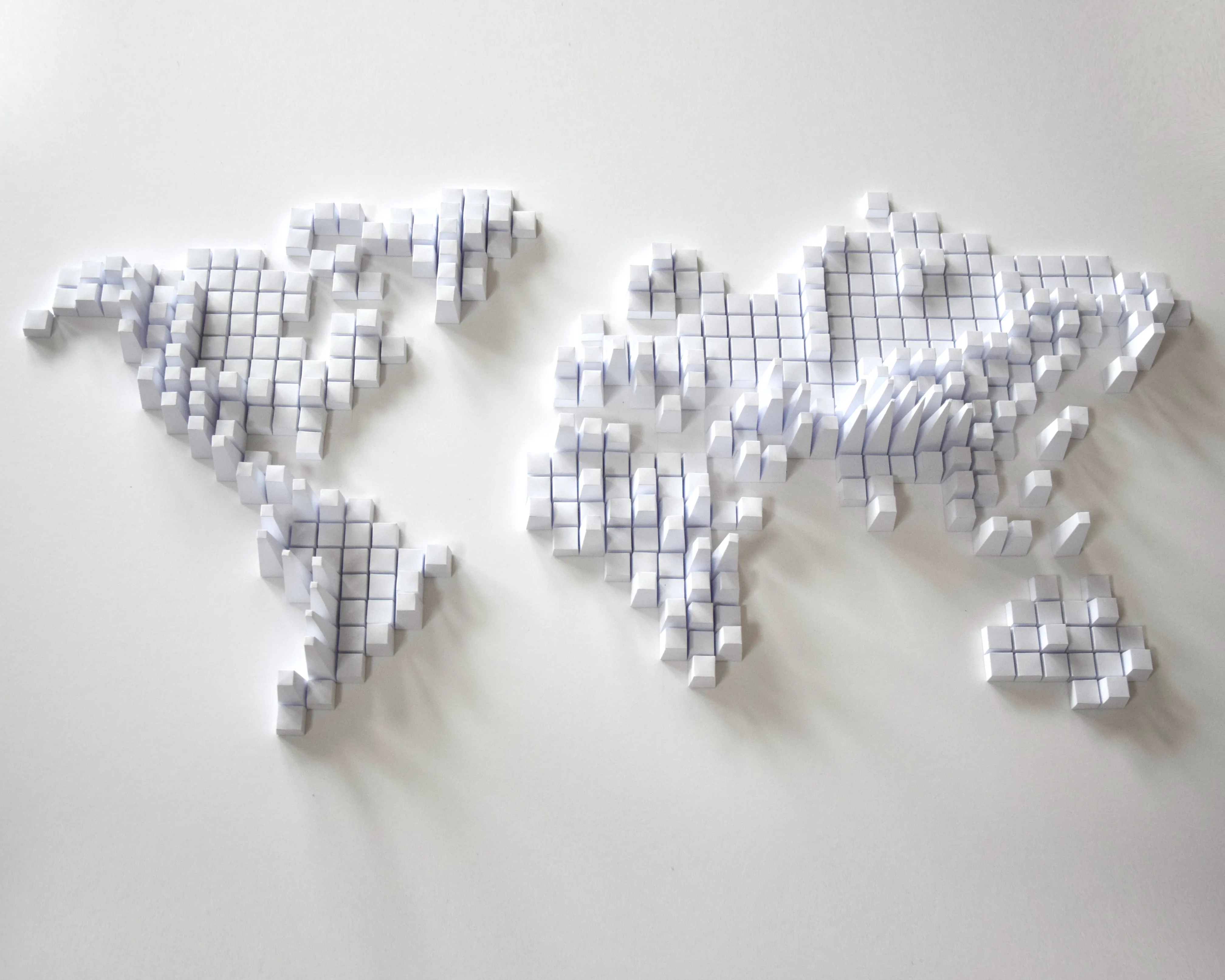 Die einzelnen Kontinente sind aus einem Raster kleiner, quadratischer Säulen zusammengesetzt, deren unterschiedliche Höhen die Vielfalt des Erdreliefs nachbilden.