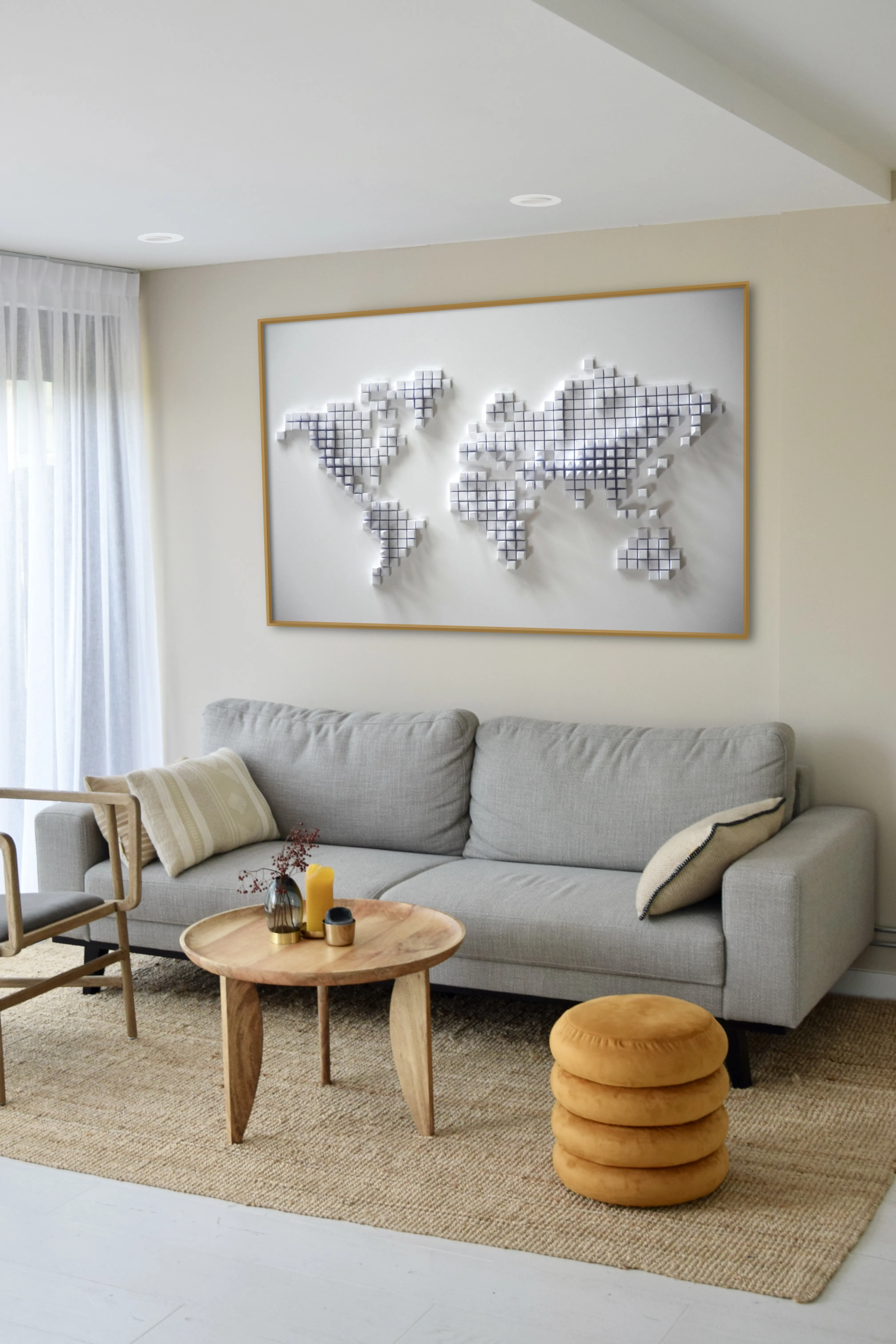 Dieses Werk ist eine dreidimensionale Interpretation einer Weltkarte mit nachgebildeten Höhenunterschieden, die sich an der topografischen Realität orientieren.