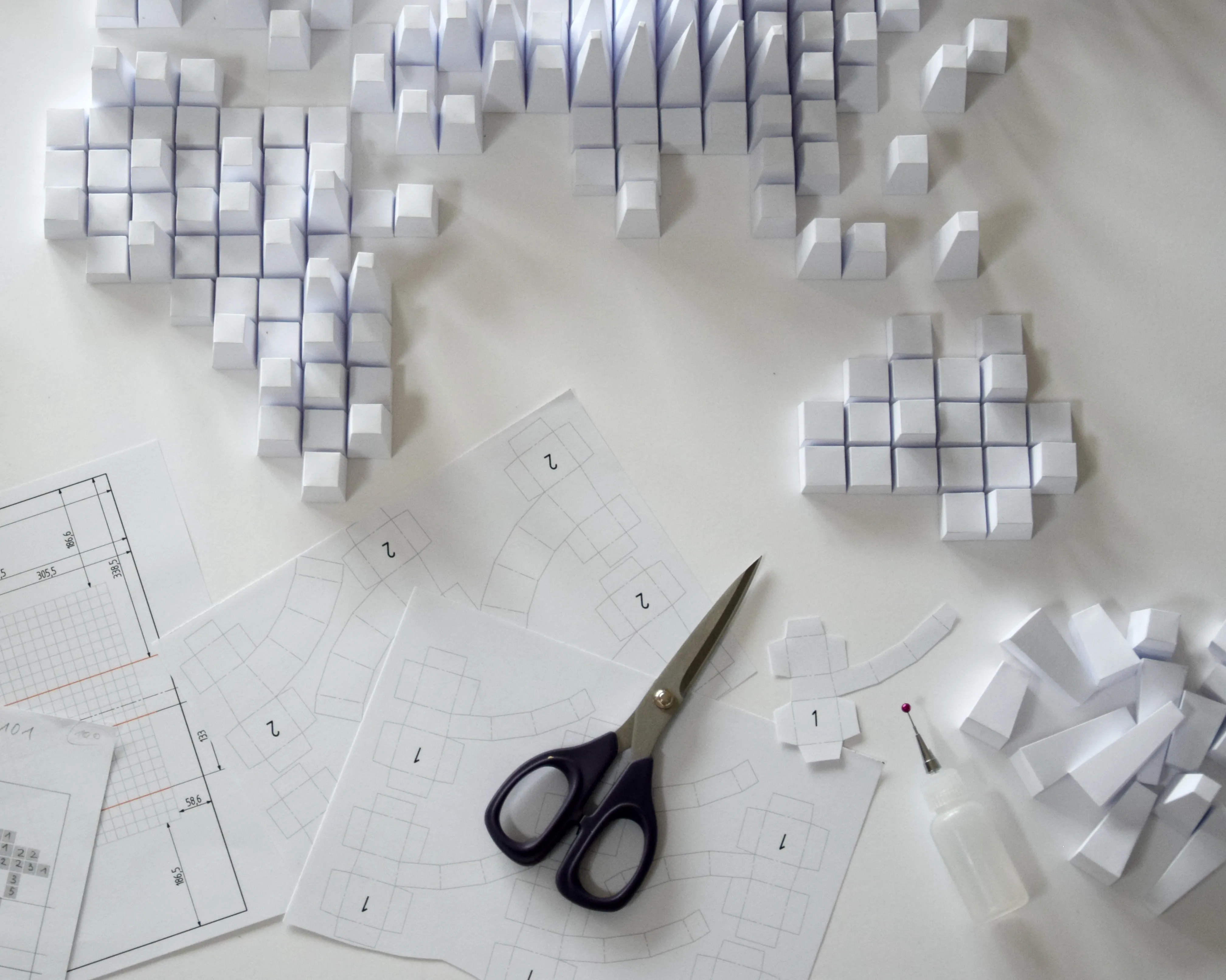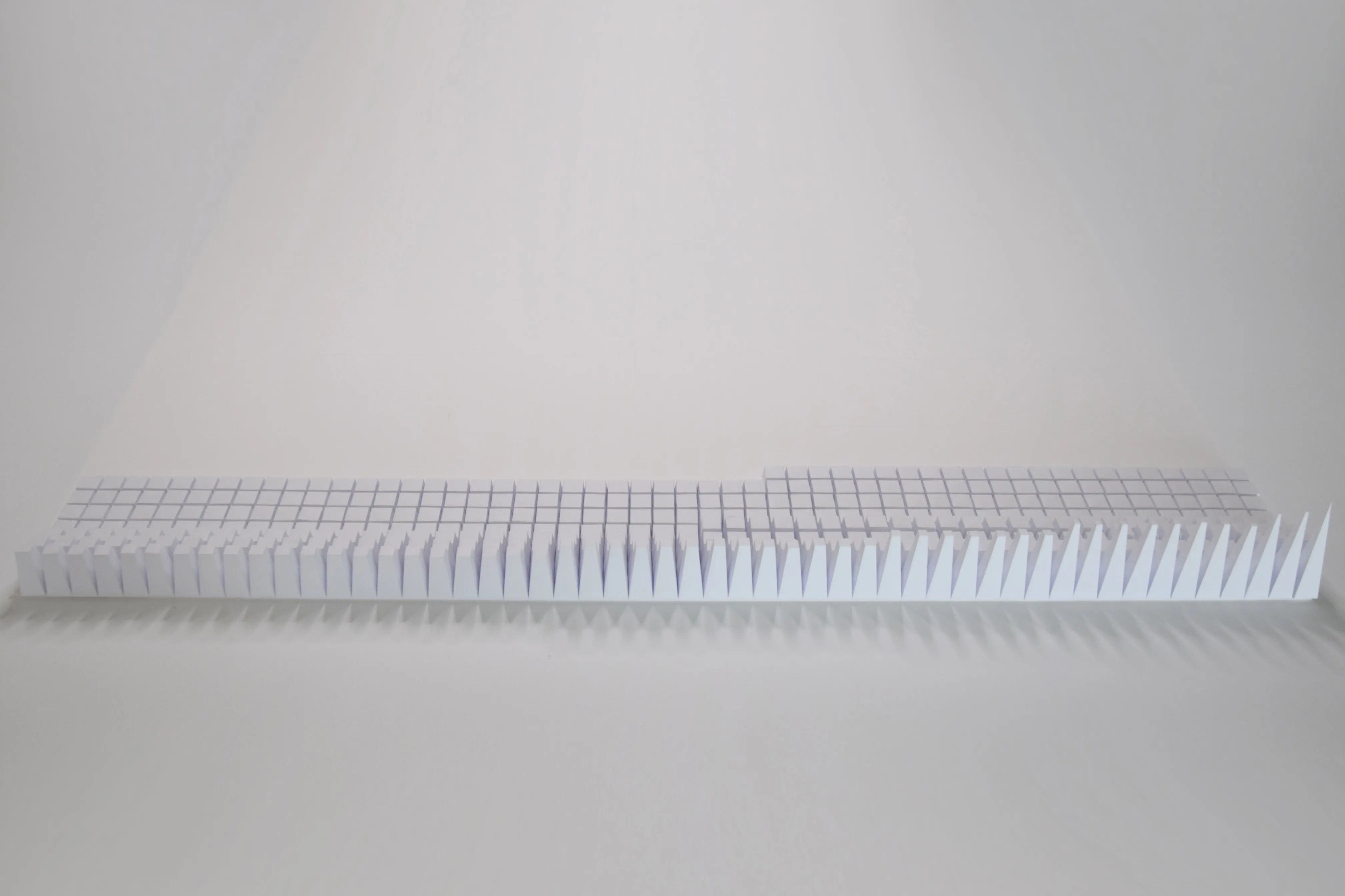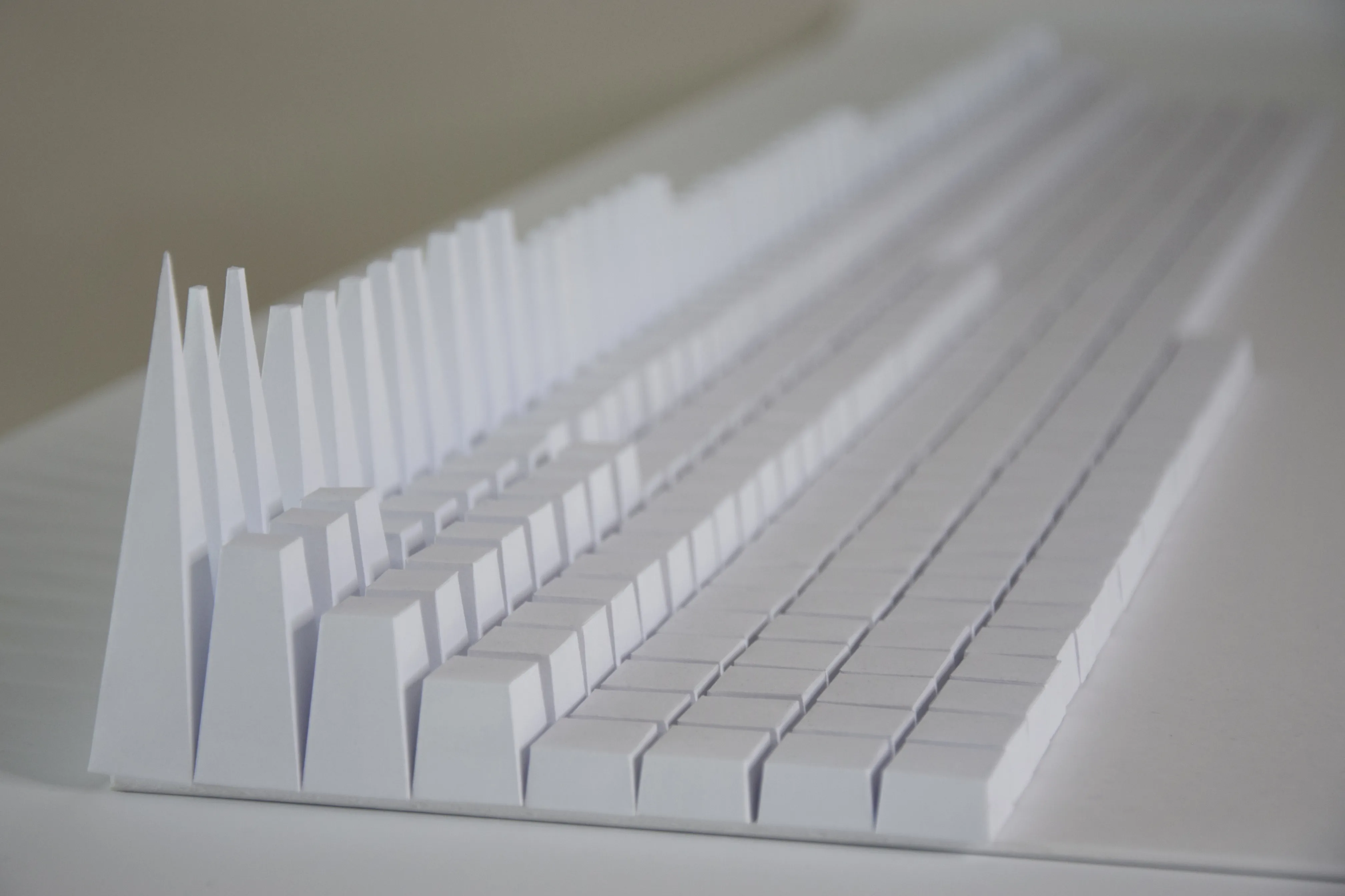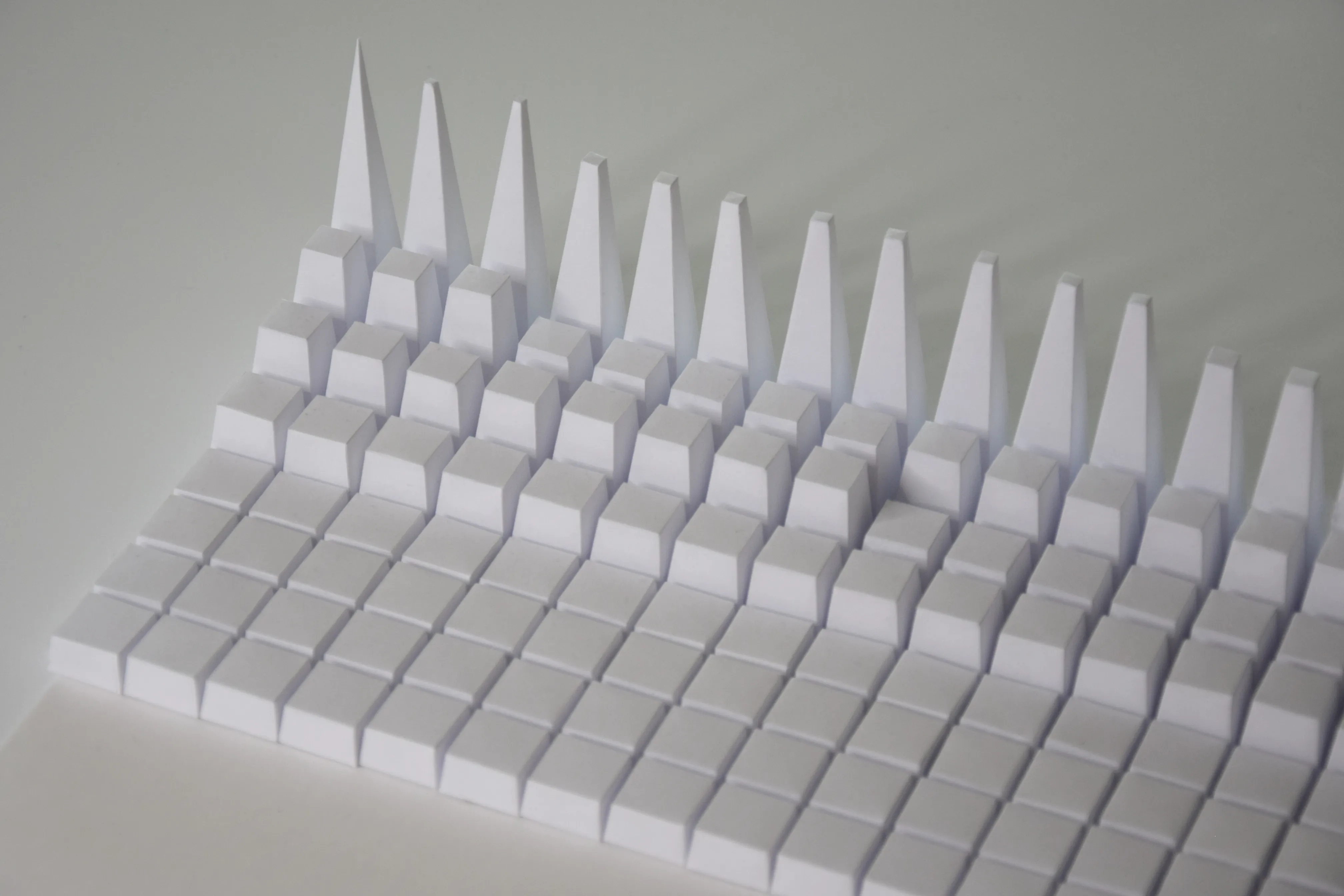 Durch die präzise Anordnung der Elemente und die reine Weißfarbe wird die Schlichtheit und Reinheit des Designs betont. Die Schattenwürfe, die durch die geometrischen Erhebungen entstehen, erzeugen ein subtiles Spiel von Licht und Textur.
